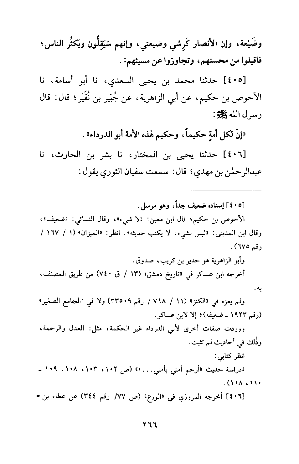 405 - حَدَّثَنَا مُحَمَّدُ بْنُ يَحْيَى السَّعْدِيُّ، نَا أَبُو أُسَامَةَ، نَا الْأَحْوَصُ بْنُ حَكِيمٍ، عَنْ أَبِي الزَّاهِرِيَّةِ، عَنْ جُبَيْرِ بْنِ نُفَيْرٍ؛ قَالَ: قَالَ رَسُولُ اللهِ صَلَّى اللَّهُ عَلَيْهِ وَسَلَّمَ: «إِنَّ لِكُلِّ أُمَّةٍ حَكِيمًا، وَحَكِيمُ هَذِهِ الْأُمَّةِ أَبُو الدَّرْدَاءِ»