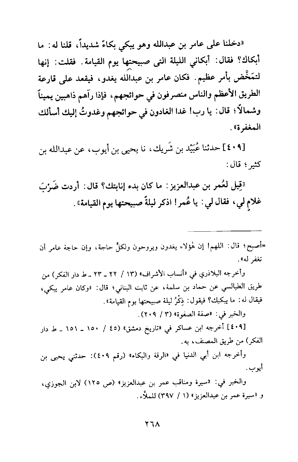 409 - حَدَّثَنَا عُبَيْدُ بْنُ شَرِيكٍ، نَا يَحْيَى بْنُ أَيُّوبَ، عَنْ عَبْدِ اللهِ بْنِ كَثِيرٍ؛ قَالَ: قِيلَ لِعُمَرَ بْنِ عَبْدِ الْعَزِيزِ: مَا كَانَ بَدْءُ إِنَابَتِكَ؟ قَالَ: أَرَدْتُ ضَرْبَ غُلَامٍ لِي، فَقَالَ لِي: يَا عُمَرُ! اذْكُرْ لَيْلَةً صَبِيحَتُهَا يَوْمُ الْقِيَامَةِ.