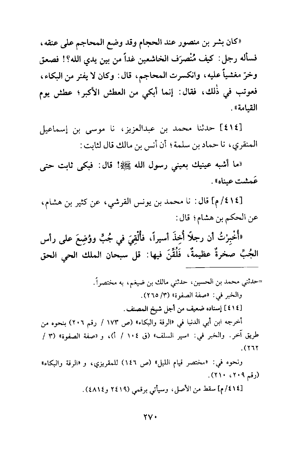 414 - / م - قَالَ: نَا مُحَمَّدُ بْنُ يُونُسَ الْقُرَشِيُّ، عَنْ كَثِيرِ بن هاشم، عَنِ الْحَكَمِ بْنِ هِشَامٍ؛ قَالَ: أُخْبِرْتُ أَنَّ رَجُلًا أُخِذَ أَسِيرًا، فَأُلْقِيَ فِي جُبٍّ وَوُضِعَ عَلَى رَأْسِ الْجُبِّ صَخْرَةٌ عَظِيمَةٌ، فَلُقِّنَ فِيهَا: قُلْ: سُبْحَانَ الْمَلِكِ الْحَيِّ الْحَقِّ -[271]- الْقُدُّوسِ! سُبْحَانَ اللهِ وَبِحَمْدِهِ! قَالَ: فَخَرَجَ مِنْ غَيْرِ أَنْ يُخْرِجَهُ إِنْسَانٌ.