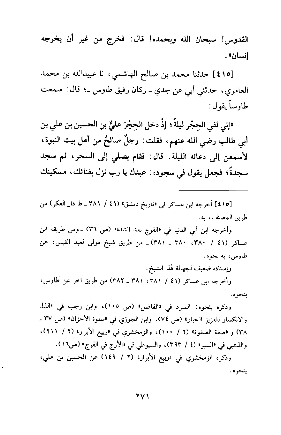 415 - حَدَّثَنَا مُحَمَّدُ بْنُ صَالِحٍ الْهَاشِمِيُّ؛ نَا عُبَيْدُ اللهِ بْنُ مُحَمَّدٍ الْعَامِرِيُّ، حَدَّثَنِي أَبِي عَنْ جَدِّي - وَكَانَ رَفِيقَ طَاوُسٍ -؛ قَالَ: سَمِعْتُ طَاوُسًا يَقُولُ: إِنِّي لَفِي الْحِجْرِ لَيْلَةً، إِذْ دَخَلَ الْحِجْرَ عَلِيُّ بْنُ الْحُسَيْنِ بْنِ عَلِيِّ بْنِ أَبِي طَالِبٍ رَضِيَ اللهُ عَنْهُمْ، فَقُلْتُ: رَجُلٌ صَالِحٌ مِنْ أَهْلِ بَيْتِ النُّبُوَّةِ، لَأَسْمَعَنَّ إِلَى دُعَائِهِ اللَّيْلَةَ. قَالَ: فَقَامَ يُصَلِّي إِلَى السَّحَرِ، ثُمَّ سَجَدَ سَجْدَةً؛ فَجَعَلَ يَقُولُ فِي سُجُودِهِ: عبدك يا رب نَزَلَ بِفِنَائِكَ، مِسْكِينُكَ -[272]- يَا رَبِّ بِفِنَائِكَ، فَقِيرُكَ يَا رَبِّ بِفِنَائِكَ. قَالَ طَاوُسٌ: فَحَفِظْتُهُنَّ؛ فَمَا دَعَوْتُ بِهِنَّ فِي كَرْبٍ إِلَّا فُرِّجَ عَنِّي.