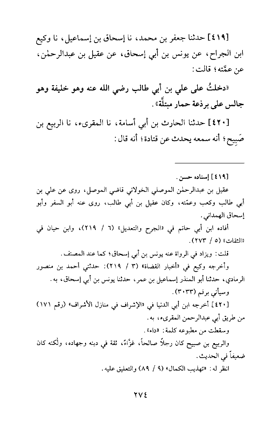 419 - حَدَّثَنَا جَعْفَرُ بْنُ مُحَمَّدٍ، نَا إِسْحَاقُ بْنُ إِسْمَاعِيلَ، نَا وَكِيعُ بْنُ الْجَرَّاحِ، عَنْ يُونُسَ بْنِ أَبِي إِسْحَاقَ، عَنْ عُقَيْلِ بْنِ عَبْدِ الرَّحْمَنِ؛ عَنْ عَمَّتِهِ؛ قَالَتْ: دَخَلْتُ عَلَى عَلِيِّ بْنِ أَبِي طَالِبٍ رَضِيَ اللهُ عَنْهُ وَهُوَ خَلِيفَةٌ، وَهُوَ جالس على برذعة حِمَارٍ مُبْتَلَّةٍ