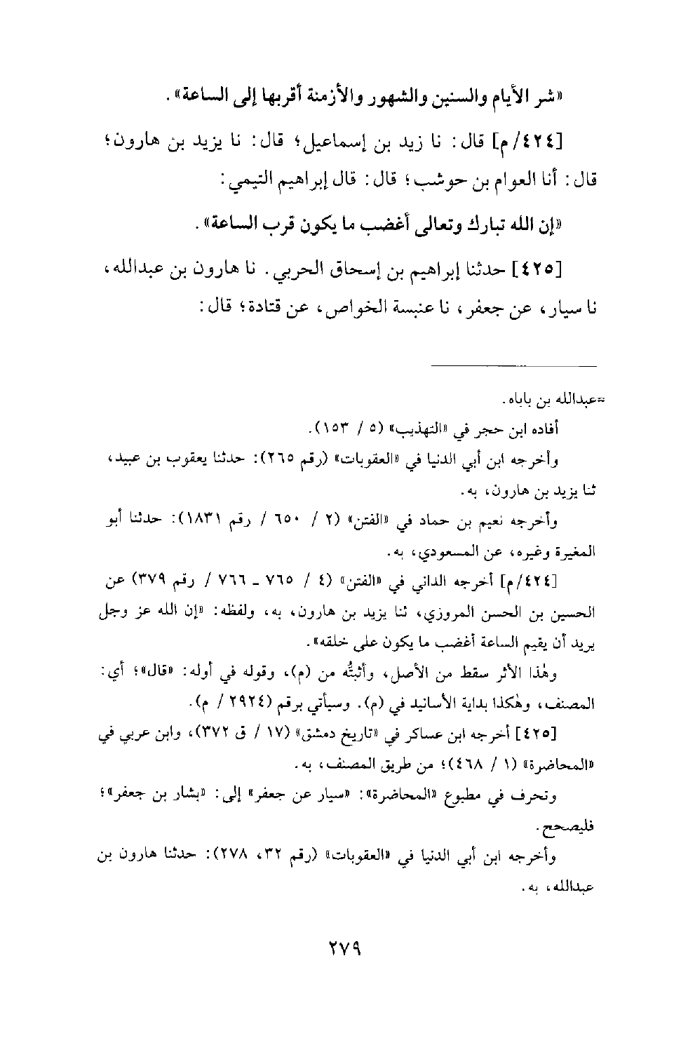 424 - / م - قَالَ: نَا زَيْدُ بْنُ إِسْمَاعِيلَ؛ قَالَ: نَا يَزِيدُ بن هارون؛ قال: أنا الْعَوَّامُ بْنُ حَوْشَبٍ؛ قَالَ: قَالَ إِبْرَاهِيمُ التَّيْمِيُّ: إِنَّ اللهَ تَبَارَكَ وَتَعَالَى أَغْضَبُ مَا يَكُونُ قُرْبَ السَّاعَةِ.