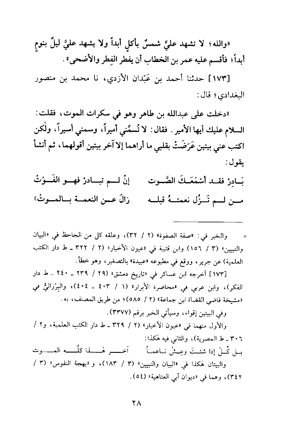 173 - حَدَّثَنَا أَحْمَدُ بْنُ عَبْدَانَ الْأَزْدِيُّ، نَا مُحَمَّدُ بْنُ مَنْصُورٍ الْبَغْدَادِيُّ؛ قَالَ: دَخَلْتُ عَلَى عَبْدِ اللهِ بْنِ طَاهِرٍ وَهُوَ فِي سَكَرَاتِ الْمَوْتِ، فَقُلْتُ: السَّلَامُ عَلَيْكَ أَيُّهَا الْأَمِيرُ. فَقَالَ: لَا تُسَمِّنِي أَمِيرًا، وَسَمِّنِي أَسِيرًا، وَلَكِنِ اكْتُبْ عَنِّي بَيْتَيْنِ عَرَضَتْ بِقَلْبِي مَا أَرَاهُمَا إِلَّا آخِرَ بَيْتَيْنِ أَقُولُهُمَا، ثُمَّ أَنْشَأَ يَقُولُ: (بَادِرْ فَقَدْ أَسْمَعَكَ الصَّوْتُ ... إِنْ لَمْ تُبَادِرْ فَهُوَ الْفَوْتُ)