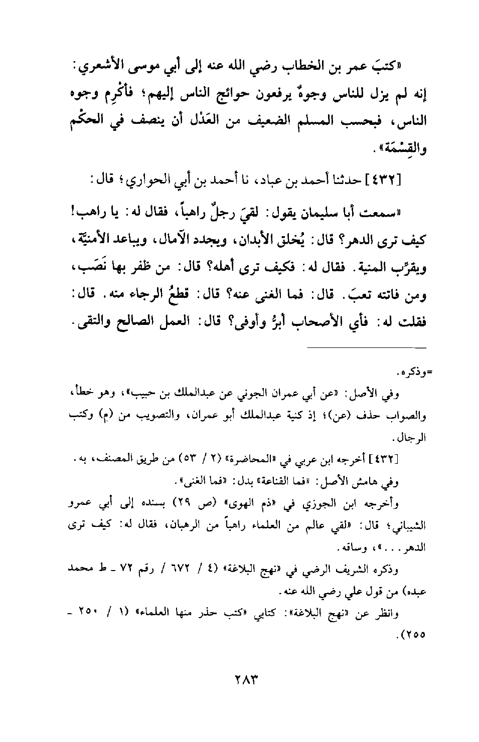 432 - حَدَّثَنَا أَحْمَدُ بْنُ عَبَّادٍ، نَا أَحْمَدُ بْنُ أَبِي الْحَوَارِيِّ؛ قَالَ: سَمِعْتُ أَبَا سُلَيْمَانَ يَقُولُ: لَقِيَ رَجُلٌ رَاهِبًا، فَقَالَ لَهُ: يَا رَاهِبُ! كَيْفَ تَرَى الدَّهْرَ؟ قَالَ: يُخْلِقُ الْأَبْدَانَ، وَيُجَدِّدُ الْآمَالَ، وَيُبَاعِدُ الْأُمْنِيَّةَ، وَيُقَرِّبُ الْمَنِيَّةَ. فَقَالَ لَهُ: فَكَيْفَ تَرَى أَهْلَهُ؟ قَالَ: مَنْ ظَفِرَ بِهَا نَصَبَ. وَمَنْ فَاتَتْهُ تَعِبَ. قَالَ: فَمَا الْغِنَى عنه؟ قَالَ: قَطْعُ الرَّجَاءِ مِنْهَ. قَالَ: فَقُلْتُ لَهُ: فَأَيُّ الْأَصْحَابِ أَبَرُّ وَأَوْفَى؟ قَالَ: العمل الصالح والتقى، -[284]- قَالَ: قُلْتُ: فَأَيْنَ الْمَخْرَجُ؟ قَالَ: فِي سُلُوكِ الْمَنْهَجِ. قَالَ: وَمَا هُوَ؟ قَالَ: بَذْلُ الْمَجْهُودِ، وَخَلْعُ الرَّاحَةِ. قال: قلت: فَأَوْصِنِي. قَالَ: قَدْ فَعَلْتُ.