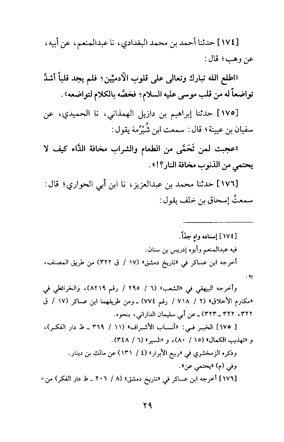 175 - حَدَّثَنَا إِبْرَاهِيمُ بْنُ دَازِيلَ الْهَمَذَانِيُّ، نَا الْحُمَيْدِيُّ، عَنْ سُفْيَانَ بْنِ عُيَيْنَةَ؛ قَالَ: سَمِعْتُ ابْنَ شُبْرُمَةَ يَقُولُ: عَجِبْتُ لِمَنْ تَحَمَّى مِنَ الطَّعَامِ وَالشَّرَابِ مُخَافَةَ الدَّاءِ كَيْفَ لَا يَحْتَمِي مِنَ الذُّنُوبِ مَخَافَةَ النَّارِ؟ !