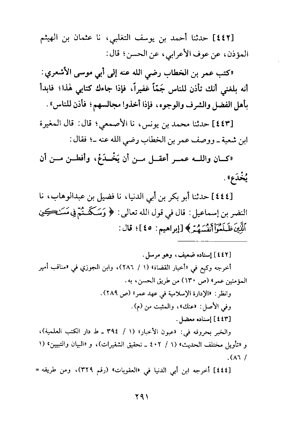 442 - حَدَّثَنَا أَحْمَدُ بْنُ يُوسُفَ التَّغْلِبِيُّ، نَا عُثْمَانُ بْنُ الْهَيْثَمِ الْمُؤَذِّنِ، عَنْ عَوْفٍ الْأَعْرَابِيِّ، عَنِ الْحَسَنِ؛ قَالَ: كَتَبَ عُمَرُ بْنُ الْخَطَّابِ رَضِيَ اللهُ عَنْهُ إِلَى أَبِي مُوسَى الْأَشْعَرِيِّ: إنه بَلَغَنِي أَنَّكَ تَأْذَنُ لِلنَّاسِ جَمًّا غفيراً، فإذا جاءك كِتَابِي هَذَا؛ فَابْدَأْ بِأَهْلِ الْفَضْلِ وَالشَّرَفِ وَالْوُجُوهِ، فَإِذَا أَخَذُوا مَجَالِسَهُمْ؛ فَأْذَنْ لِلنَّاسِ