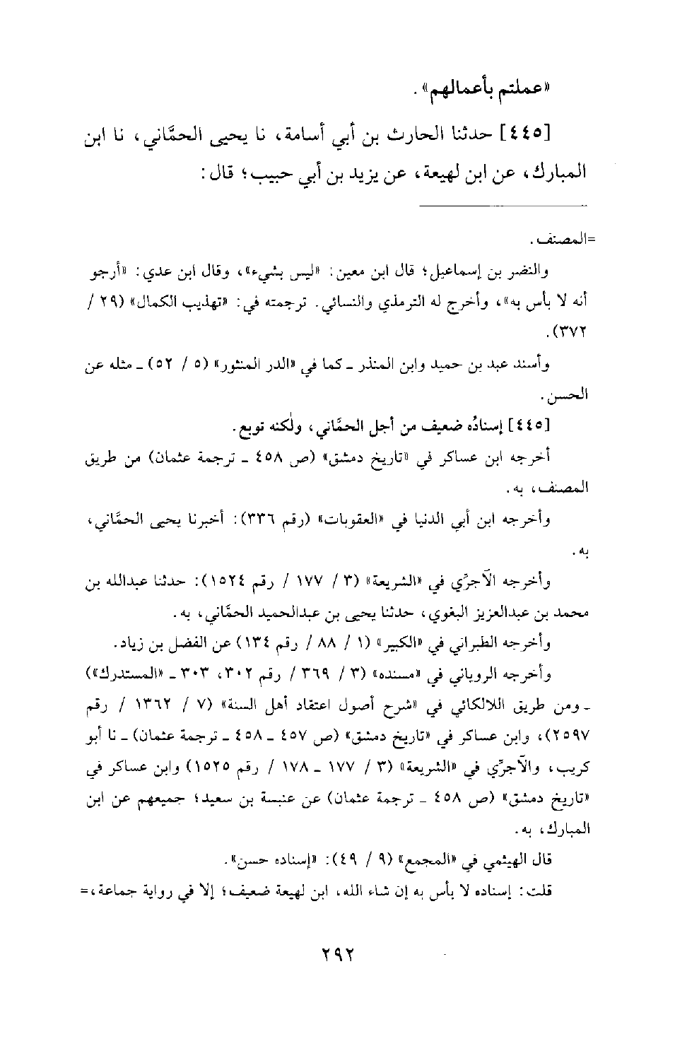 445 - حَدَّثَنَا الْحَارِثُ بْنُ أَبِي أُسَامَةَ، نَا يَحْيَى الْحِمَّانِيُّ، نَا ابْنُ الْمُبَارَكِ، عَنِ ابْنِ لَهِيعَةَ، عَنْ يَزِيدَ بْنِ أَبِي حَبِيبٍ؛ قَالَ: -[293]- بَلَغَنِي أَنَّ عَامَّةَ النَّفَرِ الَّذِينَ سَارُوا إِلَى عُثْمَانَ بْنِ عَفَّانَ رَضِيَ اللهُ عَنْهُ جُنُّوا كُلُّهُمْ. وَقَالَ ابْنُ الْمُبَارَكِ: الْجُنُونُ لَهُمْ قَلِيلٌ