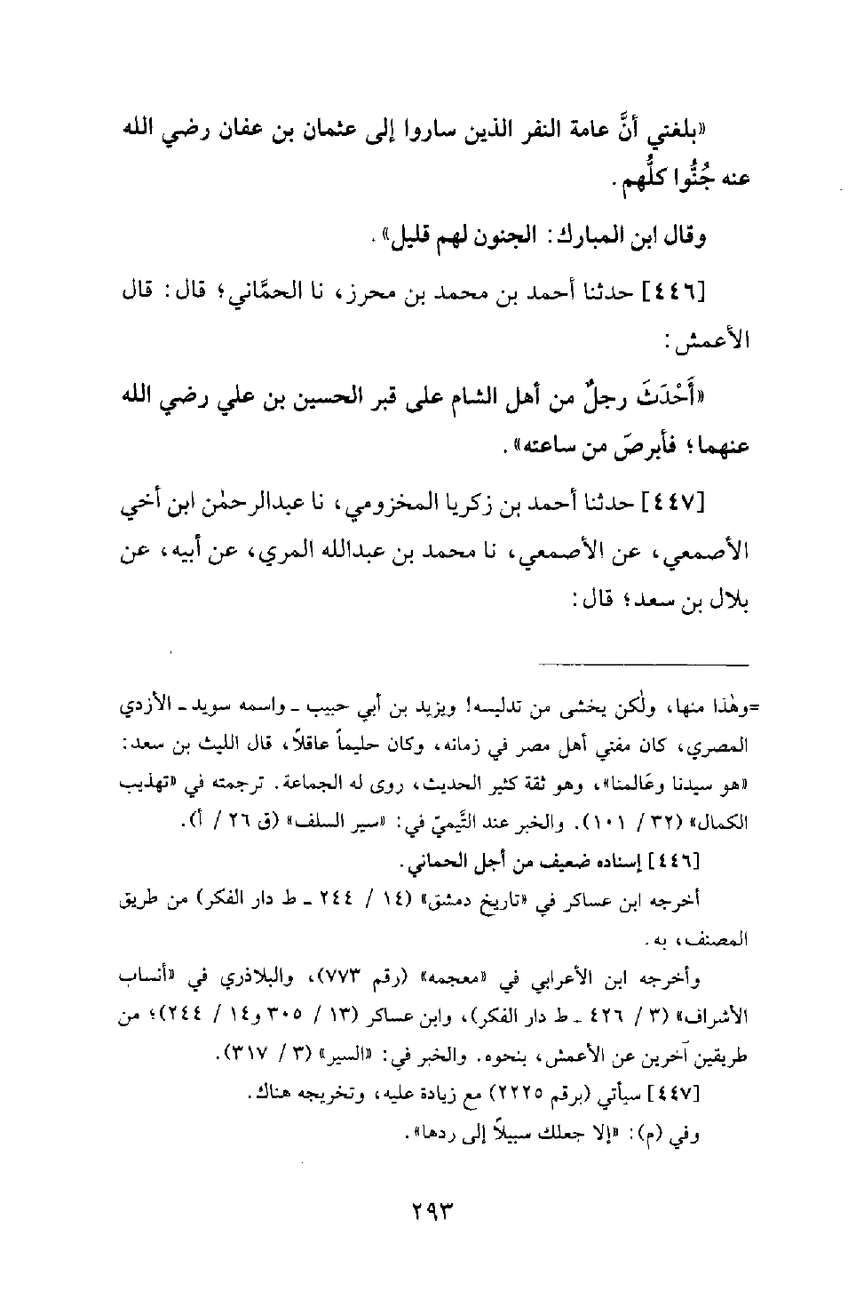 446 - حَدَّثَنَا أَحْمَدُ بْنُ مُحَمَّدِ بْنِ مُحْرِزٍ، نَا الْحِمَّانِيُّ؛ قَالَ: قَالَ الْأَعْمَشُ: أَحْدَثَ رَجُلٌ مِنْ أَهْلِ الشَّامِ عَلَى قَبْرِ الْحُسَيْنِ بْنِ عَلِيٍّ رَضِيَ اللهُ عَنْهُمَا؛ فَأَبْرَصَ مِنْ سَاعَتِهِ