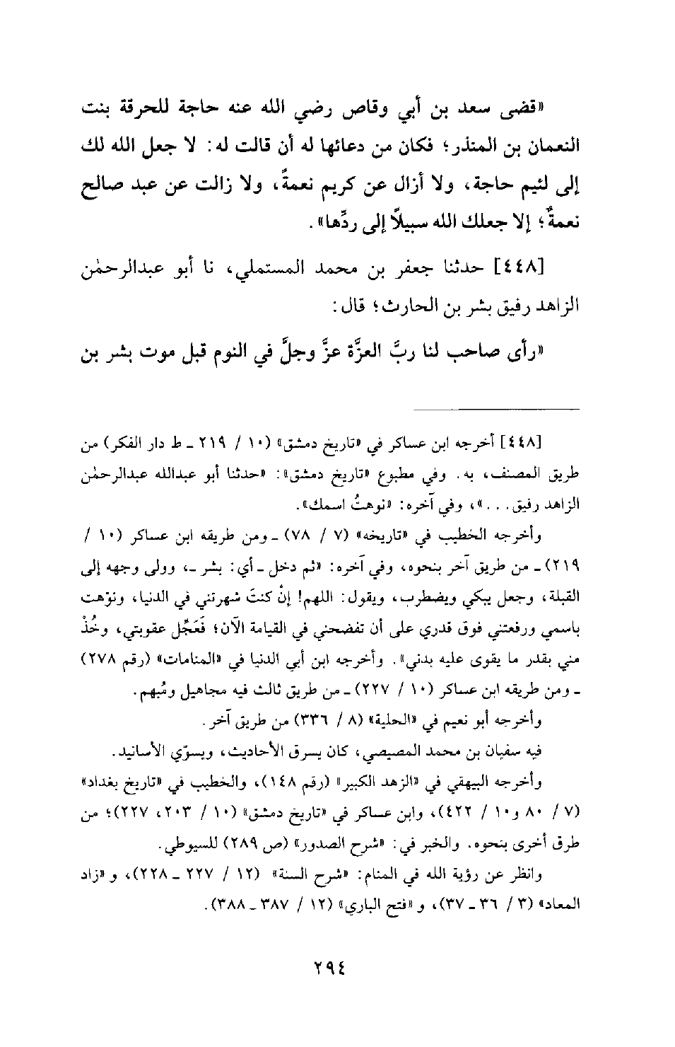 448 - حَدَّثَنَا جَعْفَرُ بْنُ مُحَمَّدٍ الْمُسْتَمْلِيُّ، نَا أَبُو عَبْدِ الرَّحْمَنِ الزَّاهِدُ رَفِيقُ بِشْرِ بْنِ الْحَارِثِ؛ قَالَ: رَأَى صَاحِبٌ لَنَا رَبَّ الْعِزَّةِ عَزَّ وَجَلَّ! فِي النَّوْمِ قَبْلَ مَوْتِ بِشْرِ بْنِ -[295]- الْحَارِثِ بِقَلِيلٍ، فَقَالَ: قُلْ لِبِشْرِ بْنِ الْحَارِثِ: لَوْ سَجَدْتَ لِي عَلَى الْجَمْرِ؛ مَا كُنْتَ تُكَافِئُنِي بِمَا نَوَّهْتُ بِاسْمِكَ فِي النَّاسِ.