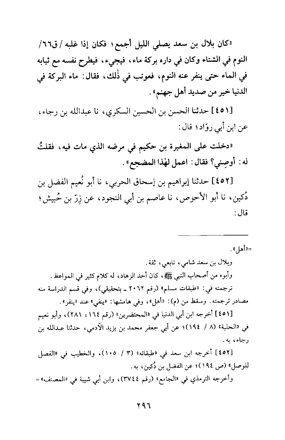 451 - حَدَّثَنَا الْحَسَنُ بْنُ الْحُسَيْنِ السُّكَّرِيُّ، نَا عَبْدُ اللهِ بْنُ رَجَاءٍ، عَنِ ابْنِ أَبِي رَوَّادٍ؛ قَالَ: دَخَلْتُ عَلَى الْمُغِيرَةِ بْنِ حَكِيمٍ فِي مَرَضِهِ الَّذِي مَاتَ فِيهِ، فقلتُ له: أوصِني؟ فَقَالَ: اعْمَلْ لِهَذَا الْمَضْجَعِ.