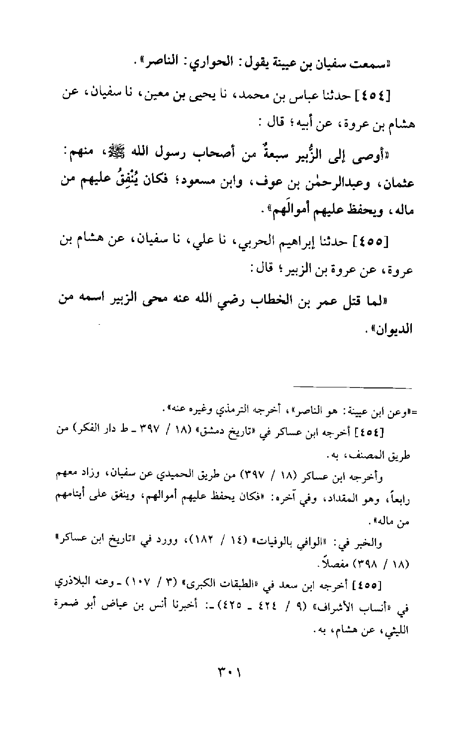 454 - حَدَّثَنَا عَبَّاسُ بْنُ مُحَمَّدٍ، نَا يَحْيَى بْنُ مَعِينٍ، نَا سُفْيَانُ، عَنْ هِشَامِ بْنِ عُرْوَةَ، عَنْ أَبِيهِ؛ قَالَ: أَوْصَى إِلَى الزُّبَيْرِ سَبْعَةٌ مِنْ أَصْحَابِ رَسُولِ اللهِ صَلَّى اللَّهُ عَلَيْهِ وَسَلَّمَ، مِنْهُمْ: عُثْمَانُ، وَعَبْدُ الرَّحْمَنِ بْنُ عَوْفٍ، وَابْنُ مَسْعُودٍ، فَكَانَ يُنْفِقُ عَلَيْهِمْ مِنْ مَالِهِ، وَيَحْفَظُ عَلَيْهِمْ أَمْوَالَهُمْ.