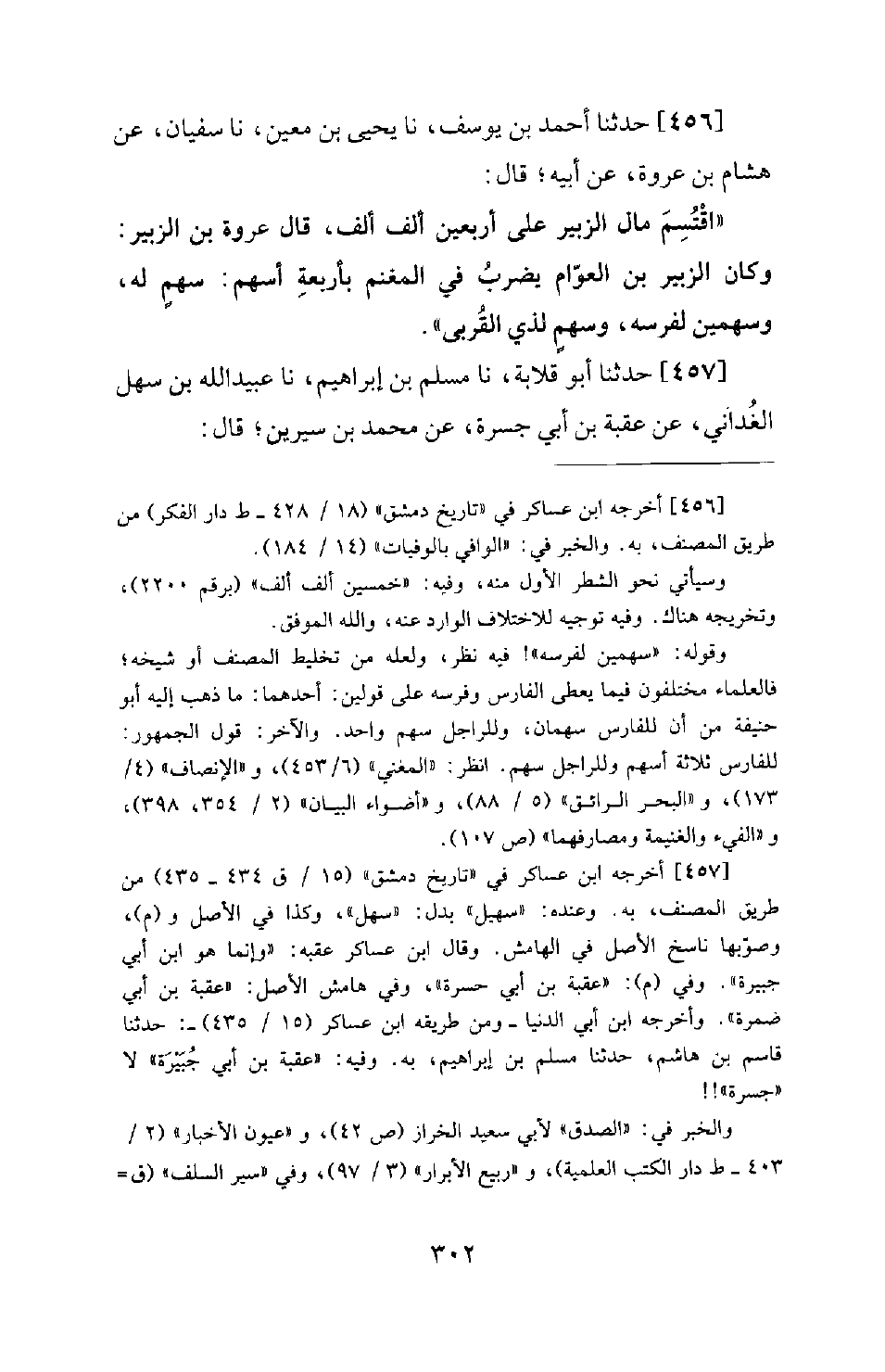 456 - حَدَّثَنَا أَحْمَدُ بْنُ يُوسُفَ، نَا يَحْيَى بْنُ مَعِينٍ، نَا سُفْيَانُ، عَنْ هِشَامِ بْنِ عُرْوَةَ، عَنْ أَبِيهِ؛ قَالَ: اقْتُسِمَ مَالُ الزُّبَيْرِ عَلَى أَرْبَعِينَ أَلْفَ أَلْفٍ، قَالَ عُرْوَةُ بْنُ الزُّبَيْرِ: وَكَانَ الزُّبَيْرُ بْنُ الْعَوَّامِ يَضْرِبُ فِي الْمَغْنَمِ بَأَرْبَعَةِ أَسْهُمٍ: سَهْمٍ لَهُ، وَسَهْمَيْنِ لِفَرَسِهِ، وَسَهْمٍ لِذِي الْقُرْبَى.