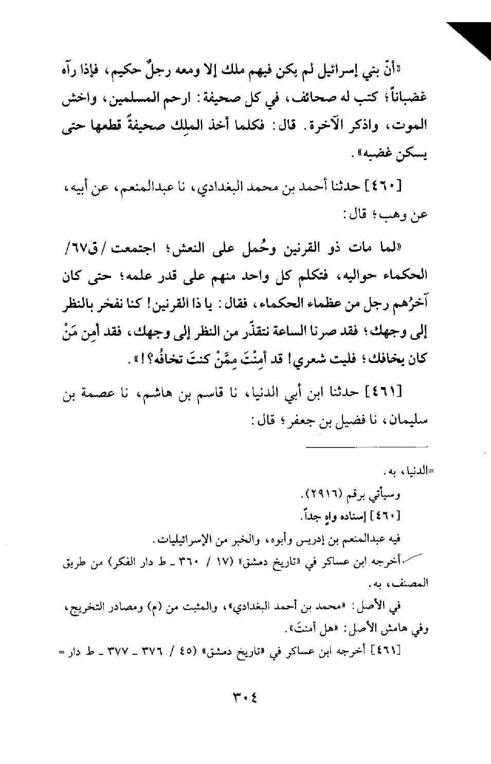 460 - حَدَّثَنَا أَحْمَدُ بْنُ مُحَمَّدٍ الْبَغْدَادِيُّ، نَا عَبْدُ الْمُنْعِمِ، عَنْ أَبِيهِ، عَنْ وَهْبٍ؛ قَالَ: لَمَّا مَاتَ ذُو الْقَرْنَيْنِ وَحُمِلَ عَلَى النَّعْشِ؛ اجْتَمَعَتِ الْحُكَمَاءُ حَوَالَيْهِ، فَتَكَلَّمَ كُلُّ وَاحِدٍ مِنْهُمْ عَلَى قَدْرِ عِلْمِهِ؛ حَتَّى كَانَ آخِرَهُمْ رَجُلٌ مِنْ عُظَمَاءِ الْحُكَمَاءِ، فَقَالَ: يَا ذَا الْقَرْنَيْنِ! كُنَّا نَفْخَرُ بِالنَّظَرِ إِلَى وَجْهِكَ؛ فَقَدْ صِرْنَا السَّاعَةَ نَتَقَذَّرُ مِنَ النَّظَرِ إِلَى وَجْهِكَ، فَقَدْ أَمِنَ مَنْ كَانَ يَخَافُكَ؛ فَلَيْتَ شِعْرِي! قَدْ أَمِنْتَ مِمَّنْ كُنْتَ تَخَافُهُ؟ !