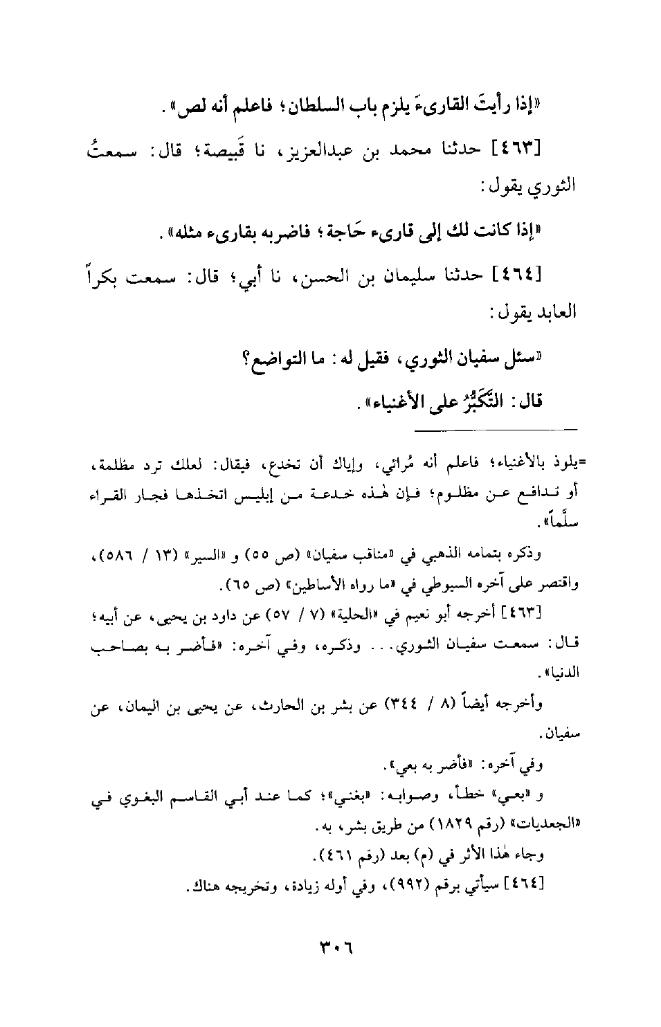 464 - حَدَّثَنَا سُلَيْمَانُ بْنُ الْحَسَنِ، نَا أَبِي؛ قَالَ: سَمِعْتُ بَكْرًا الْعَابِدَ يَقُولُ: سُئِلَ سُفْيَانُ الثَّوْرِيُّ، فَقِيلَ لَهُ: مَا التَّوَاضُعُ؟ قَالَ: التَّكَبُّرُ عَلَى الْأَغْنِيَاءِ.