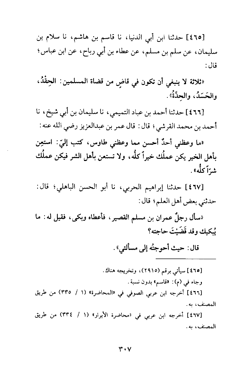 465 - حَدَّثَنَا ابْنُ أَبِي الدُّنْيَا، نَا قَاسِمُ بْنُ هَاشِمٍ، نَا سَلَامُ بْنُ سُلَيْمَانَ، عَنْ سَلْمِ بْنِ مُسْلِمٍ، عَنْ عَطَاءِ بْنِ أَبِي رَبَاحٍ، عَنِ ابْنِ عَبَّاسٍ؛ قَالَ: ثَلَاثَةٌ لَا يَنْبَغِي أَنْ تَكُونَ فِي قَاضٍ مِنْ قُضَاةِ الْمُسْلِمِينَ: الْحِقْدُ، وَالْحَسَدُ، وَالْحِدَّةُ.