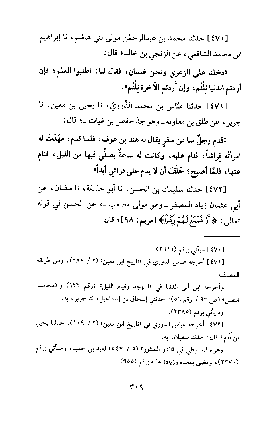 470 - حَدَّثَنَا مُحَمَّدُ بْنُ عَبْدِ الرَّحْمَنِ مَوْلَى بَنِي هَاشِمٍ، نَا إِبْرَاهِيمُ بْنُ مُحَمَّدٍ الشَّافِعِيُّ، عَنِ الزَّنْجِيِّ بْنِ خَالِدٍ؛ قَالَ: دَخَلْنَا عَلَى الزُّهْرِيِّ وَنَحْنُ غِلْمَانٌ، فَقَالَ لَنَا: اطْلُبُوا الْعِلْمَ؛ فَإِنْ أَرَدْتُمُ الدُّنْيَا نِلْتُمْ، وَإِنْ أَرَدْتُمُ الْآخِرَةَ نِلْتُمْ.