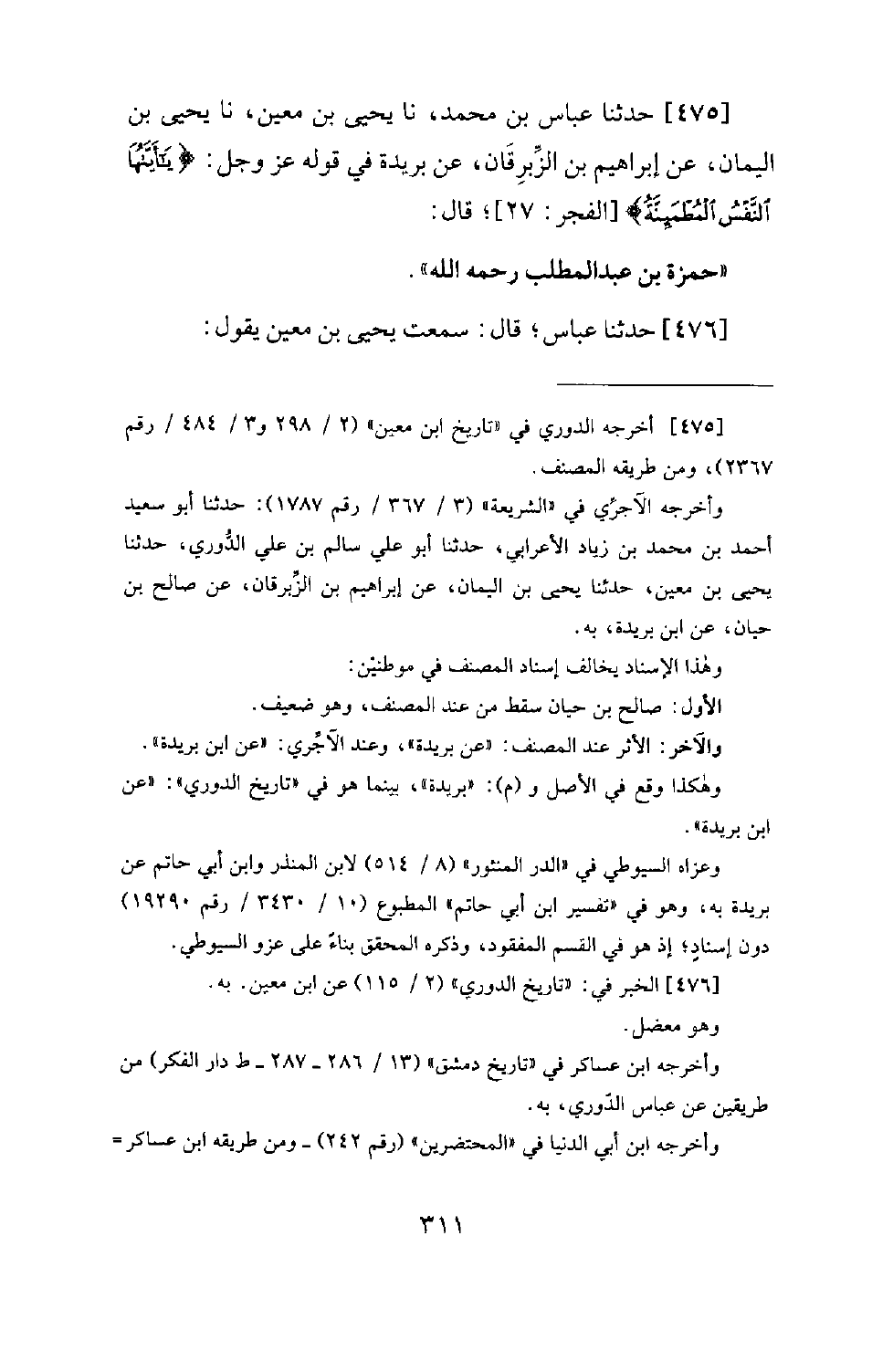 475 - حَدَّثَنَا عَبَّاسُ بْنُ مُحَمَّدٍ، نَا يَحْيَى بْنُ مَعِينٍ، نَا يَحْيَى بْنُ الْيَمَانِ، عَنْ إِبْرَاهِيمَ بْنِ الزِّبْرِقَانِ، عَنْ بُرَيْدَةَ فِي قَوْلِهِ عَزَّ وَجَلَّ: (يَأَيَّتُهَا النَّفْسُ الْمُطْمَئِنَّةُ) [الفجر: 27] ؛ قَالَ: حَمْزَةُ بْنُ عَبْدِ الْمُطَّلِبِ رَحِمَهُ اللهُ.