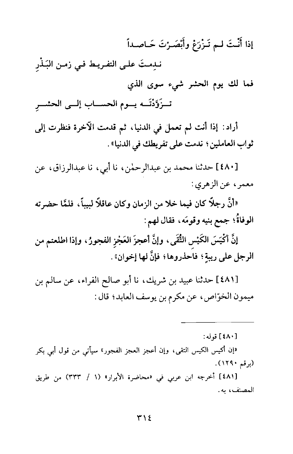 480 - حَدَّثَنَا مُحَمَّدُ بْنُ عَبْدِ الرَّحْمَنِ، نَا أَبِي، نَا عَبْدُ الرَّزَّاقِ، عَنْ مَعْمَرٍ، عَنِ الزُّهْرِيِّ: أنّ رجلاً كان فِيمَا خَلَا مِنَ الزَّمَانِ وَكَانَ عَاقِلًا لَبِيبًا، فَلَمَّا حَضَرَتْهُ الْوَفَاةُ؛ جَمَعَ بَنِيهِ وَقَوْمَهُ، فَقَالَ لَهُمْ: إِنَّ أَكْيَسَ الْكَيْسِ التُّقَى، وَإِنَّ أَعْجَزَ الْعَجْزِ الْفُجُورُ، وَإِذَا اطَّلَعْتُمْ مِنَ الرَّجُلِ عَلَى رِيبَةٍ؛ فَاحْذَرُوهَا؛ فَإِنَّ لَهَا إِخْوَانً.