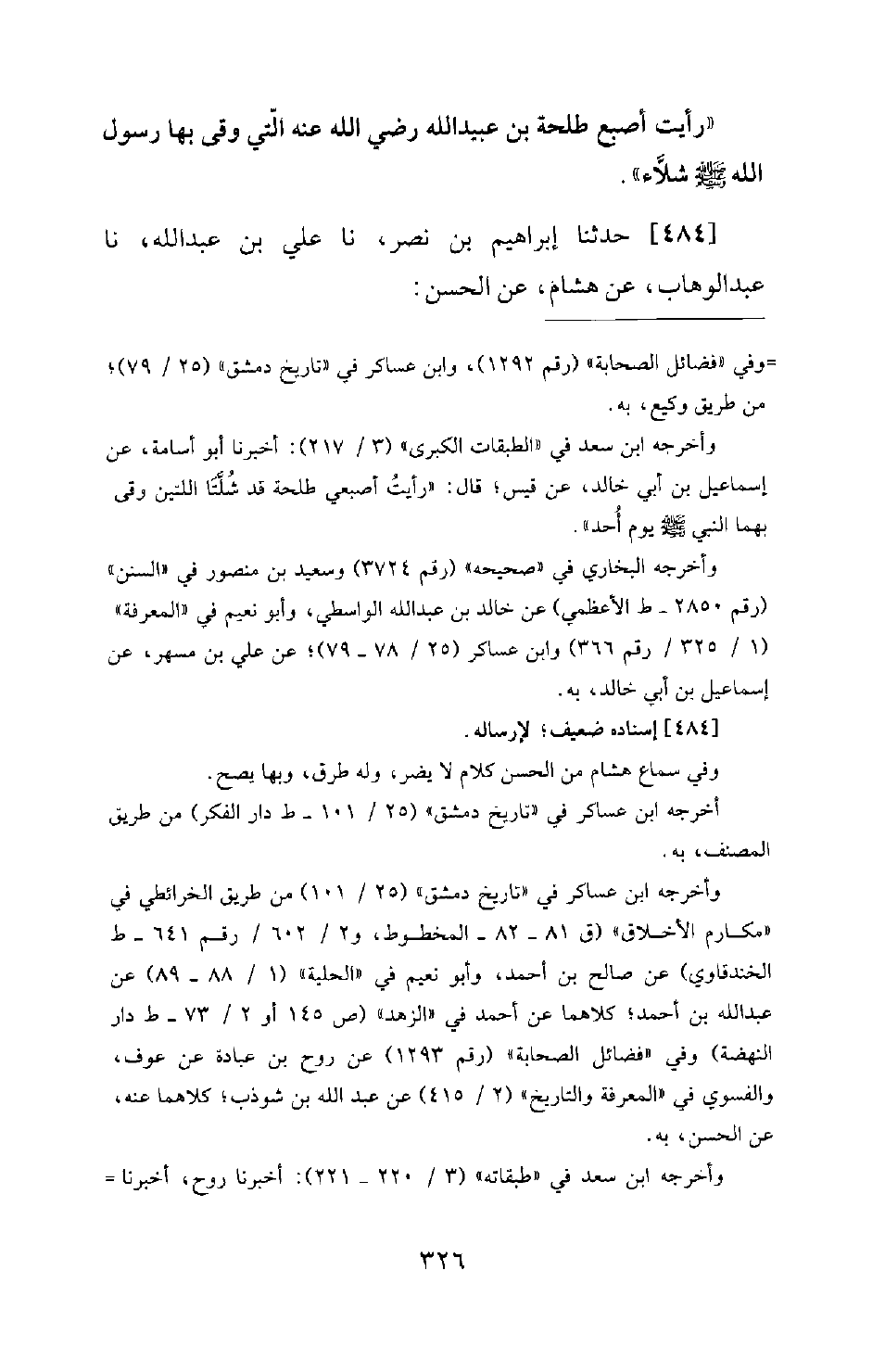 484 - حَدَّثَنَا إِبْرَاهِيمُ بْنُ نَصْرٍ، نَا عَلِيُّ بْنُ عَبْدِ اللهِ، نَا عَبْدُ الْوَهَّابِ، عَنْ هِشَامٍ، عَنِ الْحَسَنِ: -[327]- أَنَّ طَلْحَةَ بْنَ عُبَيْدِ اللهِ رَضِيَ اللهُ عَنْهُ بَاعَ أَرْضًا لَهُ مِنْ عُثْمَانَ بْنِ عَفَّانَ رَضِيَ اللهُ عَنْهُ بِسَبْعِ مئة أَلْفِ دِرْهَمٍ، قَالَ: ثُمَّ حَمَلَهَا، فَلَمَّا جَاءَ بِهَا الرَّسُولَ؛ قَالَ: إِنَّ رَجُلًا تَبِيتُ هَذِهِ فِي بَيْتِهِ لَا يَدْرِي مَا يُطْرِقُهُ مِنَ اللهِ لَغَرِيرٌ بِاللهِ. قَالَ: فَجَعَلَ رَسُولَهُ يَخْتَلِفُ فِي سِكَكِ الْمَدِينَةِ يُقَسِّمُهَا؛ فَمَا أَصْبَحَ وَعِنْدَهُ مِنْهَا دِرْهَمٌ
