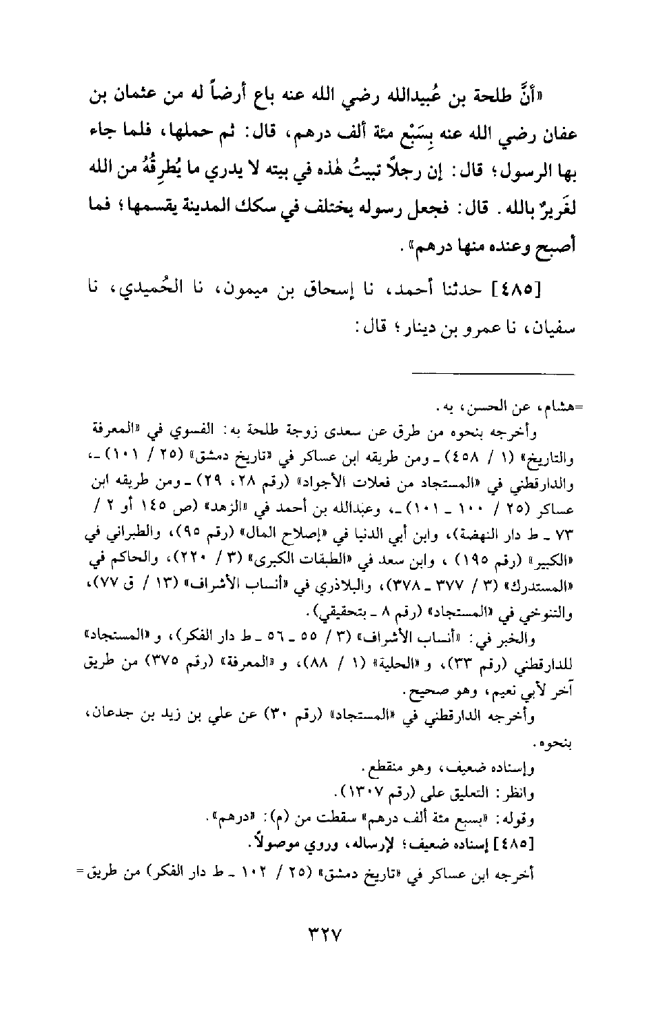 485 - حَدَّثَنَا أَحْمَدُ، نَا إِسْحَاقُ بْنُ مَيْمُونٍ، نَا الحُميدي، نا سفيان، عن عَمْرُو بْنُ دِينَارٍ؛ قَالَ: -[328]- كَانَ غَلَّةُ طَلْحَةَ بْنِ عُبَيْدِ اللهِ رَضِيَ اللهُ عَنْهُ كُلَّ يَوْمٍ أَلْفَ وَافٍ