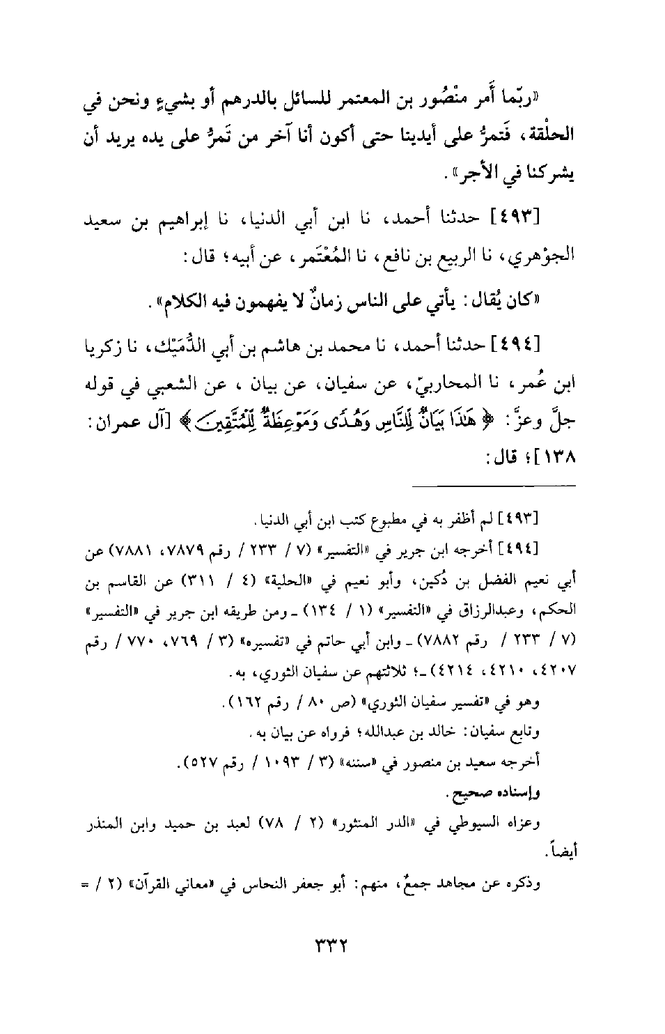 494 - حَدَّثَنَا أَحْمَدُ، نَا مُحَمَّدُ بْنُ هَاشِمِ بْنِ أَبِي الدُّمَيْكِ، نَا زَكَرِيَّا بْنُ عُمَرَ، نَا الْمُحَارِبِيُّ، عَنْ سُفْيَانَ، عَنْ بَيَانٍ، عَنِ الشَّعْبِيِّ في قوله جلّ وعزّ: (هَذَا بَيَانٌ لِلنَّاسِ وَهُدىً وَمَوْعِظَةٌ للمُتَّقِينَ (138)) [آل عمران: 138] ؛ قَالَ: -[333]- بَيَانٌ مِنَ الْعَمَى، وَهُدًى مِنَ الضَّلَالَةِ، وَمَوْعِظَةٌ مِنَ الْجَهْلِ