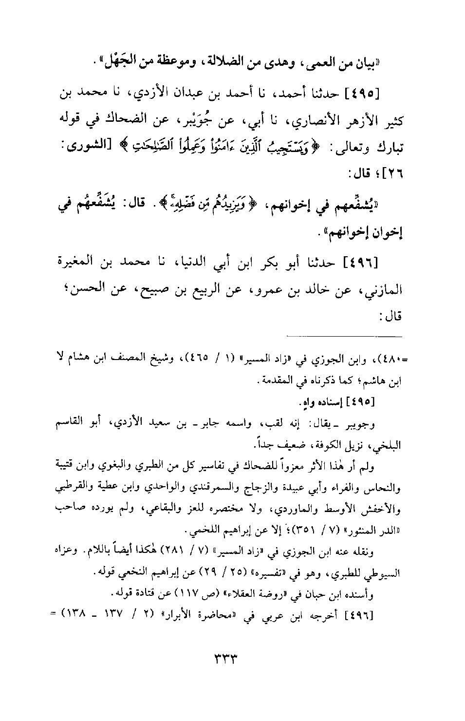 495 - حَدَّثَنَا أَحْمَدُ، نَا أَحْمَدُ بْنُ عَبْدَانَ الْأَزْدِيُّ، نَا مُحَمَّدُ بْنُ كَثِيرٍ الْأَزْهَرُ الْأَنْصَارِيُّ، نَا أَبِي، عَنْ جُوَيْبِرٍ، عَنِ الضَّحَّاكِ فِي قَوْلِهِ تَبَارَكَ وَتَعَالَى: (وَيَسْتَجيبُ الذِينَ ءامنُوا وَعَمِلُوا الصَّالِحَاتِ) [الشورى: 26] ؛ قَالَ: يُشَفِّعُهُمْ فِي إِخْوَانِهِمْ، {وَيَزِيدُهُمْ مِنْ فَضْلِهِ} . قَالَ: يُشَفِّعُهُمْ فِي إِخْوَانِ إِخْوَانِهِمْ