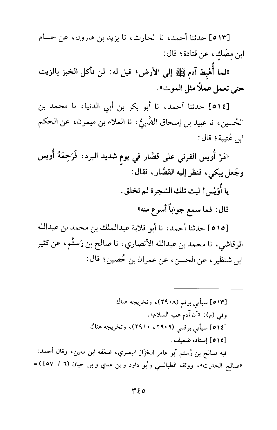 513 - حَدَّثَنَا أَحْمَدُ، نَا الْحَارِثُ، نَا يَزِيدُ بْنُ هَارُونَ، عَنْ حُسَامِ بْنِ مِصَكٍّ، عَنْ قَتَادَةَ؛ قَالَ: لَمَّا أُهْبِطَ آدَمُ صَلَّى اللَّهُ عَلَيْهِ وَسَلَّمَ إِلَى الْأَرْضِ؛ قِيلَ لَهُ: لَنْ تَأْكُلَ الْخُبْزَ بِالزَّيْتِ حَتَّى تَعْمَلَ عَمَلًا مِثْلَ الْمَوْتِ.