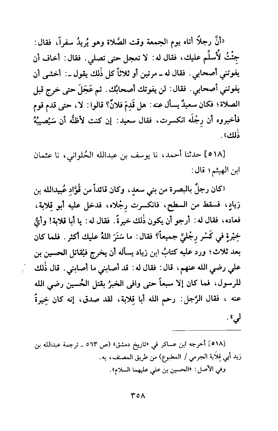 518 - حَدَّثَنَا أَحْمَدُ، نَا يُوسُفُ بْنُ عَبْدِ اللهِ الْحُلْوَانِيُّ، نَا عُثْمَانُ بْنُ الْهَيْثَمِ؛ قَالَ: كَانَ رَجُلٌ بِالْبَصْرَةِ مِنْ بَنِي سَعْدٍ، وَكَانَ قَائِدًا مِنْ قُوَّادِ عُبَيْدِ اللهِ بْنِ زِيَادٍ، فَسَقَطَ مِنَ السَّطْحِ، فَانْكَسَرَتْ رِجْلَاهُ، فَدَخَلَ عَلَيْهِ أَبُو قِلَابَةَ، فَعَادَهُ، فَقَالَ لَهُ: أَرْجُو أَنْ يَكُونَ ذَلِكَ خَيْرَةً. فَقَالَ لَهُ: يَا أَبَا قِلَابَةَ! وَأَيُّ خَيْرَةٍ فِي كَسْرِ رِجْلَيَّ جَمِيعًا؟ فَقَالَ: مَا سَتَرَ اللهُ عَلَيْكَ أَكَثْرُ. فَلَمَّا كَانَ بَعْدَ ثَلَاثٍ؛ وَرَدَ عَلَيْهِ كِتَابُ ابْنِ زِيَادٍ يَسْأَلُهُ أَنْ يَخْرُجَ فَيُقَاتِلَ الْحُسَيْنَ بْنَ عَلِيِّ رَضِيَ اللهُ عَنْهُمْ، قَالَ: فَقَالَ لَهُ: قَدْ أَصَابَنِي مَا أَصَابَنِي. قَالَ ذَلِكَ لِلرَّسُولِ، فَمَا كَانَ إِلَّا سَبْعًا حَتَّى وَافَى الْخَبَرُ بِقَتْلِ الْحُسَيْنِ رَضِيَ اللهُ عَنْهُ، فَقَالَ الرَّجُلُ: رَحِمَ اللهُ أَبَا قِلَابَةَ، لَقَدْ صَدَقَ، إِنَّهُ كَانَ خَيْرَةً لِي.