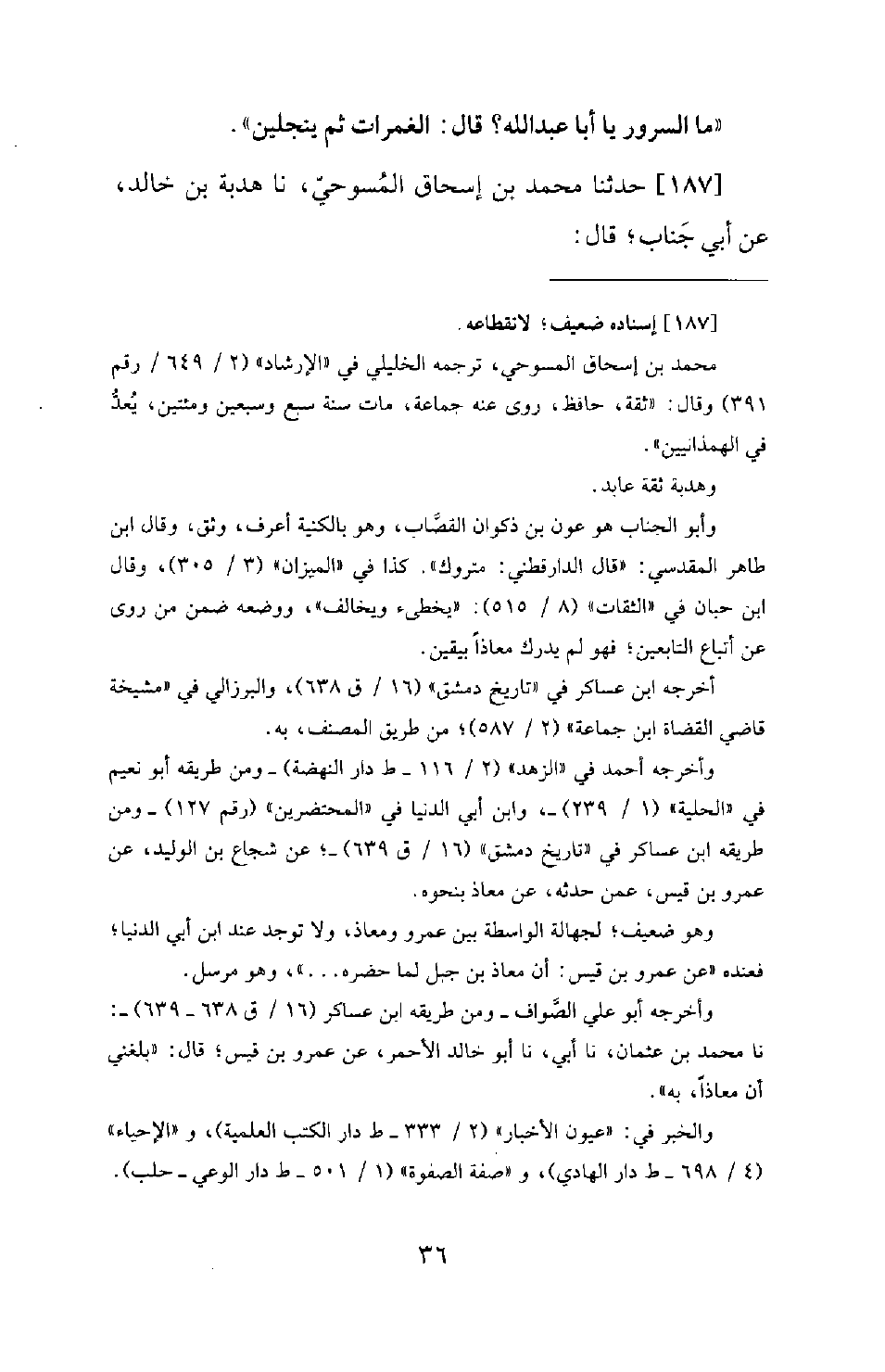 187 - حَدَّثَنَا مُحَمَّدُ بْنُ إِسْحَاقَ الْمُسُوحِيُّ، نَا هُدْبَةُ بْنُ خَالِدٍ، عَنْ أَبِي جَنَابٍ؛ قَالَ: -[37]- لَمَّا احْتُضِرَ مُعَاذُ بْنُ جَبَلٍ قَالَ: أَعُوذُ بِاللهِ مِنْ صَبَاحٍ إِلَى النَّارِ. ثُمَّ قَالَ: مَرْحَبًا بِالْحَفَظَةِ. ثُمَّ قَالَ: اللهُمَّ إِنَّكَ تَعْلَمُ أَنِّي لَمْ أَكُنْ أُحِبُّ الْبَقَاءَ فِي الدُّنْيَا لِحَفْرِ الْأَنْهَارِ وَلَا لِغَرْسِ الْأَشْجَارِ، وَلَكِنِّي كُنْتُ أُحِبُّ الْبَقَاءَ لِمُكَابَدَةِ اللَّيْلِ وَظَمَأِ الْهَوَاجِرِ فِي الحرّ الشديد