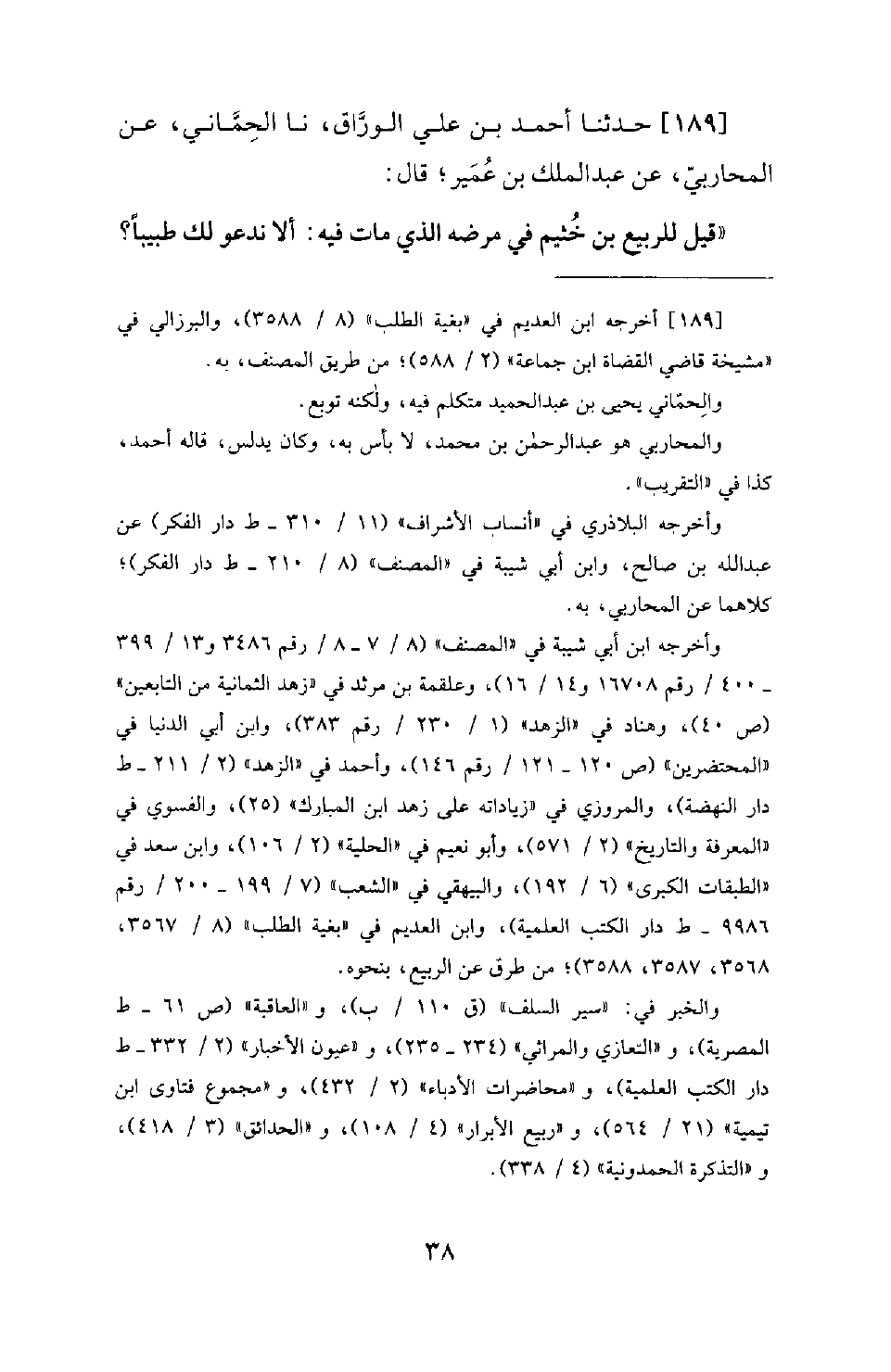 189 - حَدَّثَنَا أَحْمَدُ بْنُ عَلِيٍّ الْوَرَّاقُ، نَا الْحِمَّانِيُّ، عَنِ الْمُحَارِبِيِّ، عَنْ عَبْدِ الْمَلِكِ بْنِ عُمَيْرٍ؛ قَالَ: قِيلَ لِلرَّبِيعِ بْنِ خُثَيْمٍ فِي مَرَضِهِ الَّذِي مَاتَ فِيهِ: أَلَا نَدْعُو لَكَ طَبِيبًا؟ -[39]- فَقَالَ: أَنْظِرُونِي حَتَّى أَتَفَكَّرَ. ثُمَّ تَفَكَّرَ، فَقَالَ: إن! (وَعَاداً وَثَمُوداً وَأَصْحَابَ الرَّسِ وَقُرُونًا بَيْنَ ذلك كثيراً) [الفرقان: 38] ، قَدْ كَانَتْ فِيهِمْ أَطِبَّاءُ؛ فَمَا أَرَى الْمُدَاوِيَ بَقِيَ وَلَا الْمُدَاوَى