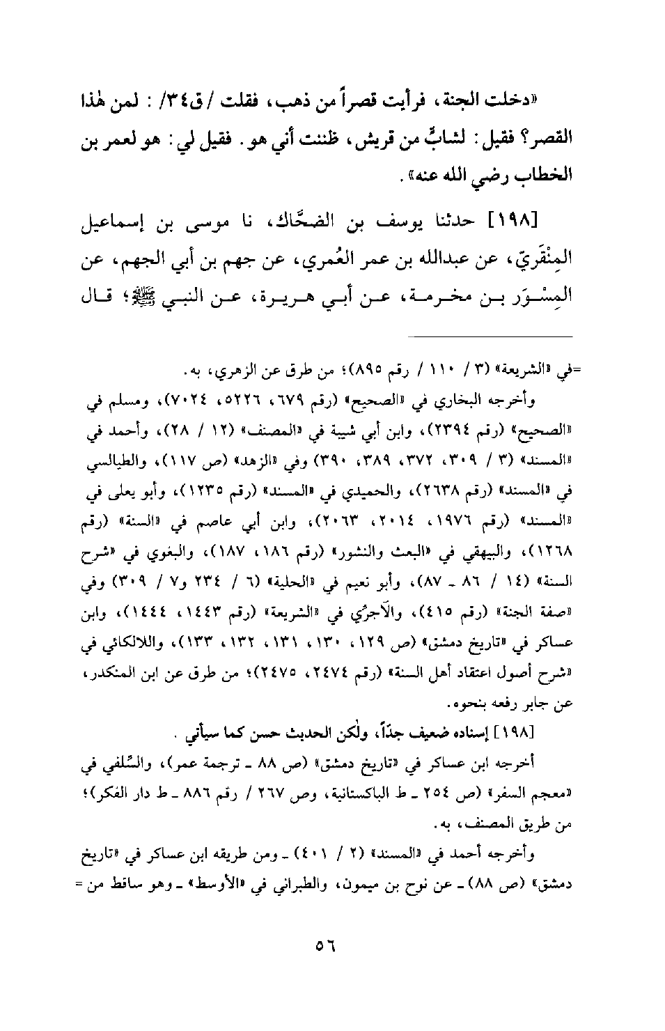 198 - حَدَّثَنَا يُوسُفُ بْنُ الضَّحَّاكِ، نَا مُوسَى بْنُ إِسْمَاعِيلَ الْمِنْقَرِيُّ، عَنْ عَبْدِ اللهِ بْنِ عُمَرَ الْعُمَرِيِّ، عَنْ جَهْمِ بْنِ أَبِي الْجَهْمِ، عَنِ الْمِسْوَرِ بْنِ مَخْرَمَةَ، عَنْ أَبِي هُرَيْرَةَ، عَنِ النَّبِيِّ صَلَّى اللَّهُ عَلَيْهِ وَسَلَّمَ؛ قَالَ -[68]-: «إِنَّ اللهَ سُبْحَانَهُ جَعَلَ الْحَقَّ عَلَى لِسَانِ عُمَرَ وَقَلْبِهِ»