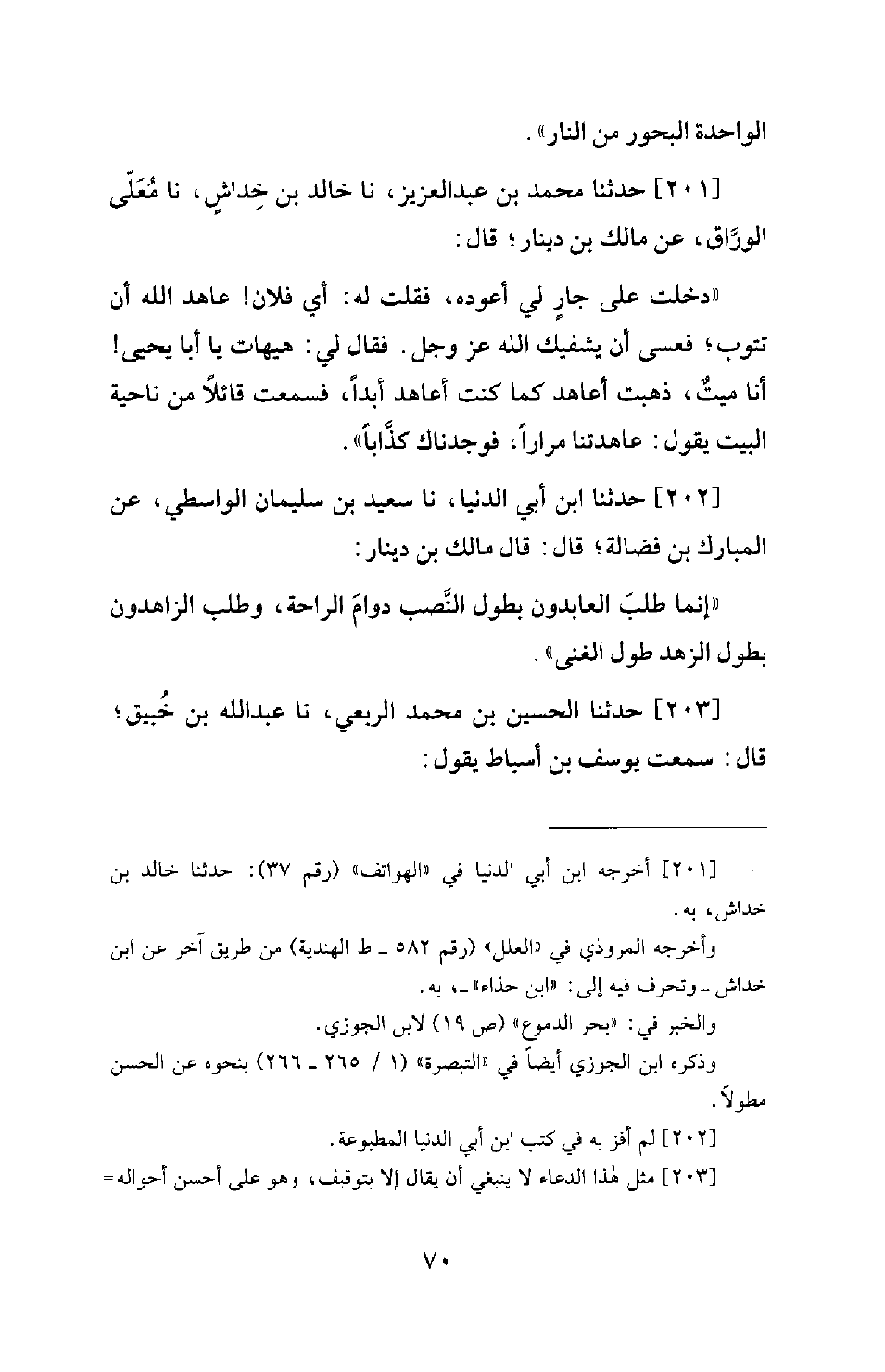 201 - حَدَّثَنَا مُحَمَّدُ بْنُ عَبْدِ الْعَزِيزِ، نَا خَالِدُ بْنُ خِدَاشٍ، نَا مُعَلَّى الْوَرَّاقُ، عَنْ مَالِكِ بْنِ دِينَارٍ؛ قَالَ: دَخَلْتُ عَلَى جَارٍ لِي أَعُودُهُ، فَقُلْتُ لَهُ: أَيْ فُلَانُ! عَاهِدِ اللهَ أَنْ تَتُوبَ؛ فَعَسَى أَنْ يَشْفِيَكَ اللهُ عَزَّ وَجَلَّ. فَقَالَ لِي: هَيْهَاتَ يَا أَبَا يَحْيَى! أَنَا مَيِّتٌ، ذَهَبْتُ أُعَاهِدُ كَمَا كُنْتُ أُعَاهِدُ أَبَدًا، فَسَمِعْتُ قَائِلًا مِنْ نَاحِيَةِ الْبَيْتِ يَقُولُ: عَاهَدْتَنَا مِرَارًا، فَوَجَدْنَاكَ كَذَّابًا.