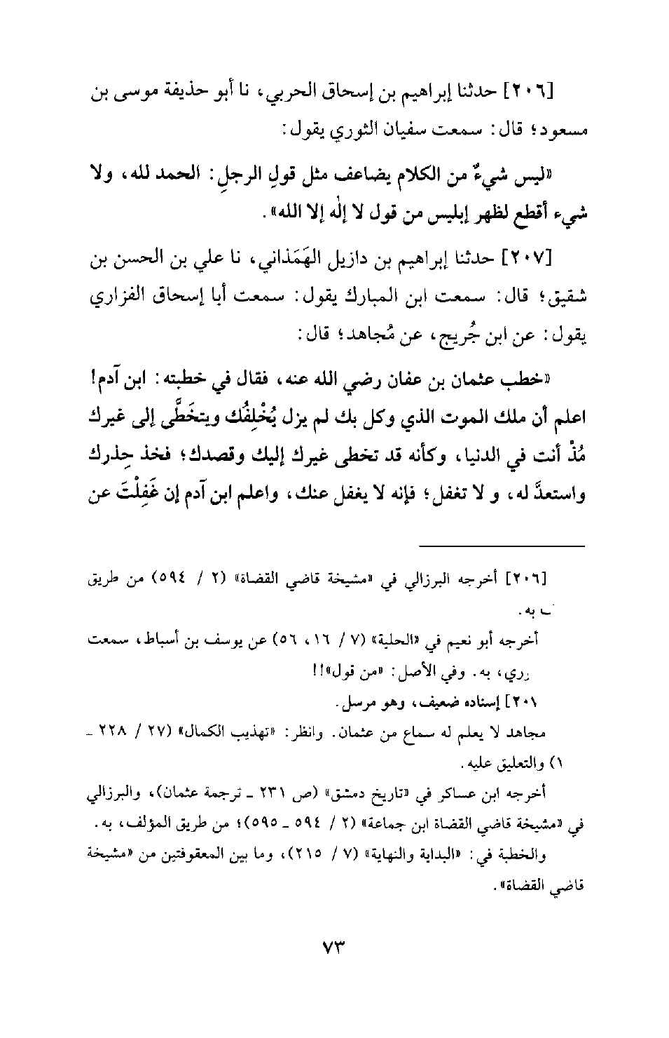 207 - حَدَّثَنَا إِبْرَاهِيمُ بْنُ دَازِيلَ الْهَمَذَانِيُّ، نَا عَلِيُّ بْنُ الْحَسَنِ بْنِ شَقِيقٍ؛ قَالَ: سَمِعْتُ ابْنَ الْمُبَارَكِ يَقُولُ: سَمِعْتُ أَبَا إِسْحَاقَ الْفَزَارِيَّ يَقُولُ: عَنِ ابْنِ جُرَيْجٍ، عَنْ مُجَاهِدٍ؛ قَالَ: خَطَبَ عُثْمَانُ بْنُ عَفَّانَ رَضِيَ اللهُ عَنْهُ، فَقَالَ فِي خُطْبَتِهِ: ابْنَ آدَمَ! اعْلَمْ أَنَّ مَلَكَ الْمَوْتِ الَّذِي وُكِلَ بِكَ لَمْ يَزَلْ يُخْلِفُكَ وَيَتَخَطَّى إِلَى غَيْرِكَ مُذْ أَنْتَ فِي الدُّنْيَا، وَكَأَنَّهُ قَدْ تَخَطَّى غَيْرَكَ إِلَيْكَ وَقَصَدَكَ؛ فَخُذْ حِذْرَكَ وَاسْتَعِدَّ لَهُ، وَلَا تَغْفَلْ؛ فَإِنَّهُ لَا يَغْفَلُ عَنْكَ، وَاعْلَمِ ابْنَ آدَمَ إِنْ غَفِلْتَ عَنْ -[74]- نَفْسِكَ وَلَمْ تَسْتَعِدَّ [لَهَا] ؛ لَمْ يَسْتَعِدَّ لَهَا غَيْرُكَ، وَلَا بُدَّ مِنْ لِقَاءِ اللهِ عَزَّ وَجَلَّ؛ فَخُذْ لِنَفْسِكَ وَلَا تَكِلْهَا إِلَى غَيْرِكَ، وَالسَّلَامُ