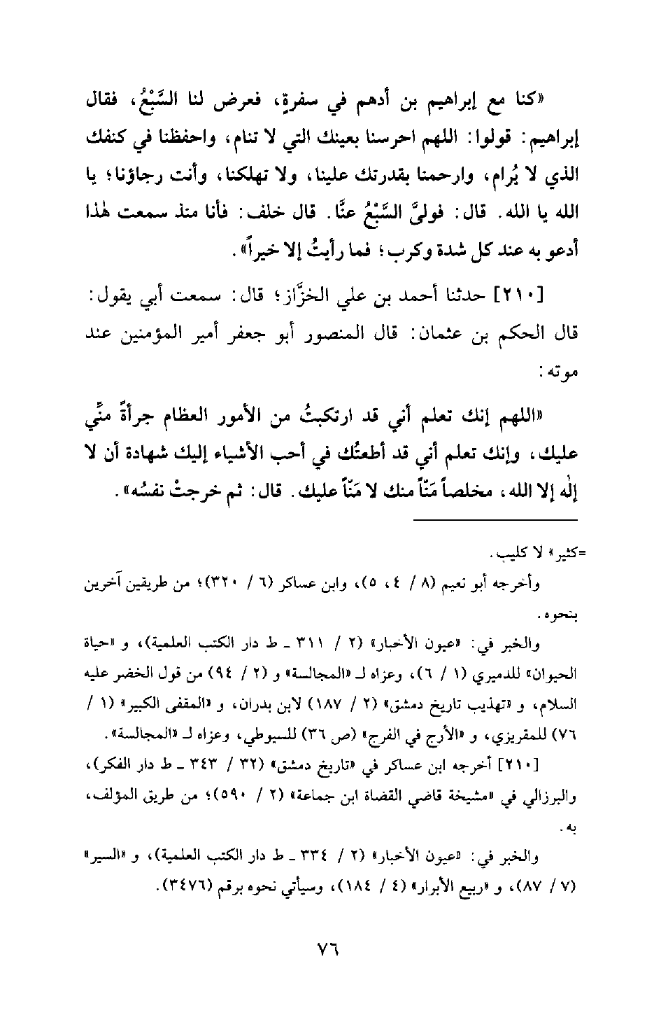 210 - حَدَّثَنَا أَحْمَدُ بْنُ عَلِيٍّ الْخَزَّازُ؛ قَالَ: سَمِعْتُ أَبِي يَقُولُ: قَالَ الْحَكَمُ بْنُ عُثْمَانَ: قَالَ الْمَنْصُورُ أَبُو جَعْفَرٍ أَمِيرُ الْمُؤْمِنِينَ عِنْدَ مَوْتِهِ: اللهُمَّ إِنَّكَ تَعْلَمُ أَنِّي قَدِ ارْتَكَبْتُ مِنَ الْأُمُورِ الْعِظَامَ جُرْأَةً مِنِّي عَلَيْكَ، وَإِنَّكَ تَعْلَمُ أَنِّي قَدْ أَطَعْتُكَ فِي أَحَبِّ الْأَشْيَاءِ إِلَيْكَ؛ شَهَادَةُ أَنْ لَا إِلَهَ إِلَّا اللهُ، مُخْلِصًا، مَناًّ مِنْكَ لَا مَنًّا عَلَيْكَ. قَالَ: ثُمَّ خَرَجَتْ نَفْسُهُ.