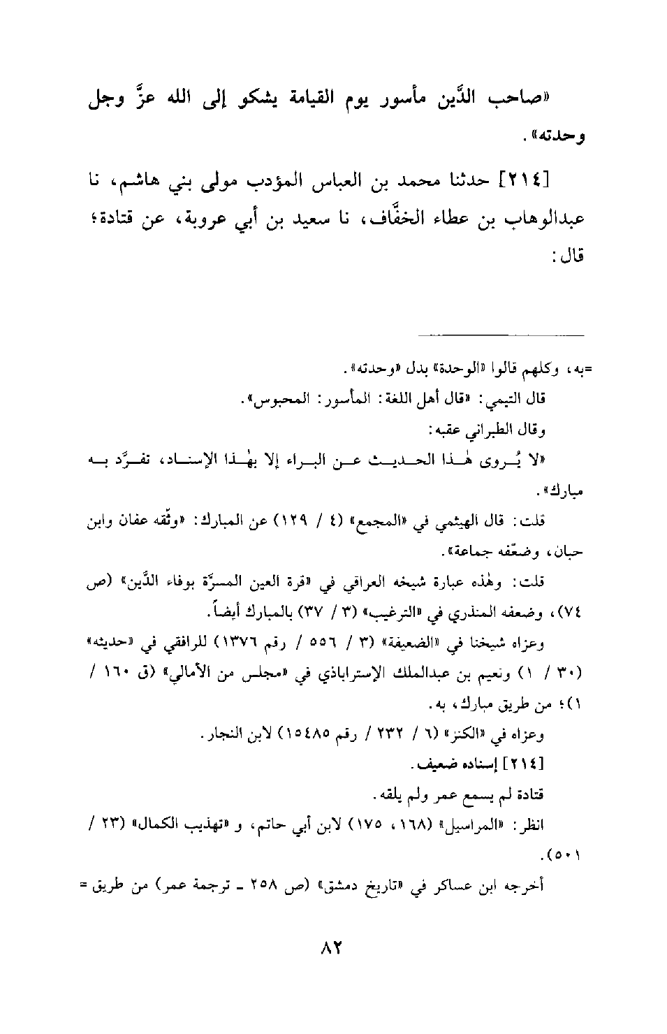 214 - حَدَّثَنَا مُحَمَّدُ بْنُ الْعَبَّاسِ الْمُؤَدِّبُ مَوْلَى بَنِي هَاشِمٍ، نَا عَبْدُ الْوَهَّابِ بْنُ عَطَاءٍ الْخَفَّافُ، نَا سَعِيدُ بْنُ أَبِي عَرُوبَةَ، عَنْ قَتَادَةَ قَالَ: -[83]- كَانَ عُمَرُ بْنُ الْخَطَّابِ رَضِيَ اللهُ عَنْهُ يَلْبَسُ وَهُوَ أَمِيرُ الْمُؤْمِنِينَ جُبَّةً مِنْ صُوفٍ مَرْقُوعَةً بَعْضُهَا بَأَدَمٍ، وَيَطُوفُ فِي الْأَسْوَاقِ عَلَى عَاتِقِهِ الدِّرَّةُ يُؤَدِّبُ النَّاسَ بِهَا، وَيَمُرُّ بِالنِّكْثِ وَالنَّوَى؛ فَيَلْتَقِطُهُ وَيُلْقِيهِ فِي مَنَازِلِ النَّاسِ لِيَنْتَفِعُوا بِذَلِكَ