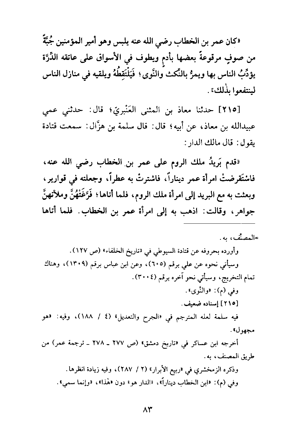 215 - حَدَّثَنَا مُعَاذُ بْنُ الْمُثَنَّى الْعَنْبَرِيُّ؛ قَالَ: حَدَّثَنِي عَمِّي عُبَيْدُ اللهِ بْنُ مُعَاذٍ، عَنْ أَبِيهِ؛ قَالَ: قَالَ سَلَمَةُ بْنُ هَزَّالٍ: سَمِعْتُ قَتَادَةَ يَقُولُ: قَالَ مَالِكُ الدَّارِ: قَدِمَ بَرِيدُ مَلِكِ الرُّومِ عَلَى عُمَرَ بْنِ الْخَطَّابِ رَضِيَ اللهُ عَنْهُ فَاسْتَقْرَضَتِ امْرَأَةُ عُمَرَ دِينَارًا، فَاشْتَرَتْ بِهِ عِطْرًا، وَجَعَلَتْهُ فِي قَوَارِيرَ، وَبَعَثَتْ بِهِ مَعَ الْبَرِيدِ إِلَى امْرَأَةِ مَلِكِ الرُّومِ، فَلَمَّا أَتَاهَا؛ فَرَّغَتْهُنَّ وَمَلَأَتْهُنَّ جَوَاهِرَ، وقالت: اذهب به إِلَى امْرَأَةِ عُمَرَ بْنِ الْخَطَّابِ. فَلَمَّا أَتَاهَا -[84]- فَرَّغَتْهُنَّ عَلَى الْبُسَاطِ، فَدَخَلَ عُمَرُ بْنُ الْخَطَّابِ، فَقَالَ: مَا هَذَا؟ فَأَخْبَرَتْهُ بِالْخَبَرِ، فَأَخَذَ عُمَرُ الْجَوَاهِرَ، وَبَاعَهُ، وَدَفَعَ إِلَى امْرَأَتِهِ دِينَارًا، وَجَعَلَ مَا بَقِيَ مِنْ ذَلِكَ فِي بَيْتِ مَالِ الْمُسْلِمِينَ