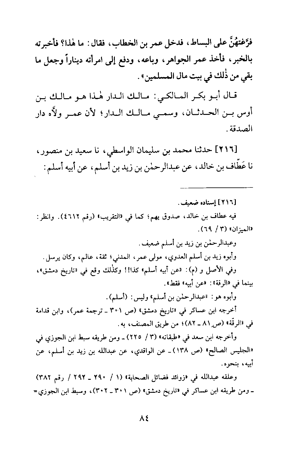 216 - حَدَّثَنَا مُحَمَّدُ بْنُ سُلَيْمَانَ الْوَاسِطِيُّ، نَا سَعِيدُ بْنُ مَنْصُورٍ، نَا عَطَّافُ بْنُ خَالِدٍ، عَنْ عَبْدِ الرَّحْمَنِ بْنِ زَيْدِ بْنِ أَسْلَمَ، عَنْ أَبِيهِ أَسْلَمَ: -[85]- أَنَّ عُمَرَ بْنَ الْخَطَّابِ رَضِيَ اللهُ عَنْهُ طَافَ لَيْلَةً، فَإِذَا هُوَ بِامْرَأَةٍ فِي جَوْفِ دَارٍ لَهَا، وَحَوْلَهَا صِبْيَانٌ يَبْكُونَ، وَإِذَا قِدْرٌ عَلَى النَّارِ قَدْ مَلَأَتْهَا مَاءً، فَدَنَا عُمَرُ بْنُ الْخَطَّابِ مِنَ الْبَابِ، فَقَالَ لَهَا: يَا أَمَةَ اللهِ! أَيْشَ بُكَاءُ هَؤُلَاءِ الصِّبْيَانِ؟ فَقَالَتْ: بُكَاؤُهُمْ مِنَ الْجُوعِ. قَالَ: فَمَا هَذِهِ الْقِدْرُ الَّتِي عَلَى النَّارِ؟ فَقَالَتْ: قَدْ جَعَلْتُ فِيهَا مَاءً هُوَ ذَا أُعَلِّلُهُمْ بِهِ حَتَّى يَنَامُوا، وَأُوهِمُهُمْ أَنَّ فِيهَا شَيْئًا. فَجَلَسَ عُمَرُ رَضِيَ اللهُ عَنْهُ، فَبَكَى، قَالَ: ثُمَّ جَاءَ إِلَى دَارِ الصَّدَقَةِ، وَأَخَذَ غِرَارَةً، وَجَعَلَ فِيهَا شَيْئًا مِنْ دَقِيقٍ وَسَمْنٍ وَشَحْمٍ وَتَمْرٍ وَثِيَابٍ وَدَرَاهِمَ حَتَّى مَلَأَ الْغِرَارَةَ، ثُمَّ قَالَ: يَا أَسْلَمُ! احْمِلْ عَلَيَّ. قَالَ: فَقُلْتُ يَا أَمِيرَ الْمُؤْمِنِينَ! أَنَا أَحْمِلُهُ عَنْكَ. فَقَالَ لِي: لَا أُمَّ لَكَ يَا أَسْلَمُ، بَلْ أَنَا أَحْمِلُهُ لِأَنِّي أَنَا المسؤول عنه فِي الْآخِرَةِ. قَالَ: فَحَمَلَهُ عَلَى عُنُقِهِ حَتَّى أَتَى بِهِ مَنْزِلَ الْمَرْأَةِ، قَالَ: وَأَخَذَ الْقِدْرَ فَجَعَلَ فِيهَا دَقِيقًا وَشَيْئًا مِنْ شَحْمٍ وتمر، وجعل يحركه بيديه، وَيَنْفُخُ تَحْتَ الْقِدْرِ، قَالَ أَسْلَمُ: وَكَانَتْ لِحْيَتُهُ عَظِيمَةً، فَرَأَيْتُ الدُّخَانَ يَخْرُجُ مِنْ خَلَلِ لِحْيَتِهِ، حَتَّى طَبَخَ لَهُمْ، ثُمَّ جَعَلَ يَغْرِفُ بِيَدِهِ وَيُطْعِمُهُمْ حَتَّى شَبِعُوا، ثُمَّ خَرَجَ وَرَبَضَ بِحِذَائِهِمْ كَأَنَّهُ سَبُعٌ، وَخِفْتُ مِنْهُ أَنْ أُكَلِّمَهُ، فَلَمْ يَزَلْ كَذَلِكَ حَتَّى -[86]- لَعِبُوا وَضَحِكُوا الصِّبْيَانُ. ثُمَّ قَامَ، فَقَالَ: يَا أَسْلَمُ! تَدْرِي لِمَ ربضت بحذاهم؟ قُلْتُ: لَا يَا أَمِيرَ الْمُؤْمِنِينَ. قَالَ: رَأَيْتُهُمْ يَبْكُونَ؛ فَكَرِهْتُ أَنْ أَذْهَبَ وَأَدَعَهُمْ حَتَّى أَرَاهُمْ يَضْحَكُونَ، فَلَمَّا ضَحِكُوا؛ طَابَتْ نَفْسِي
