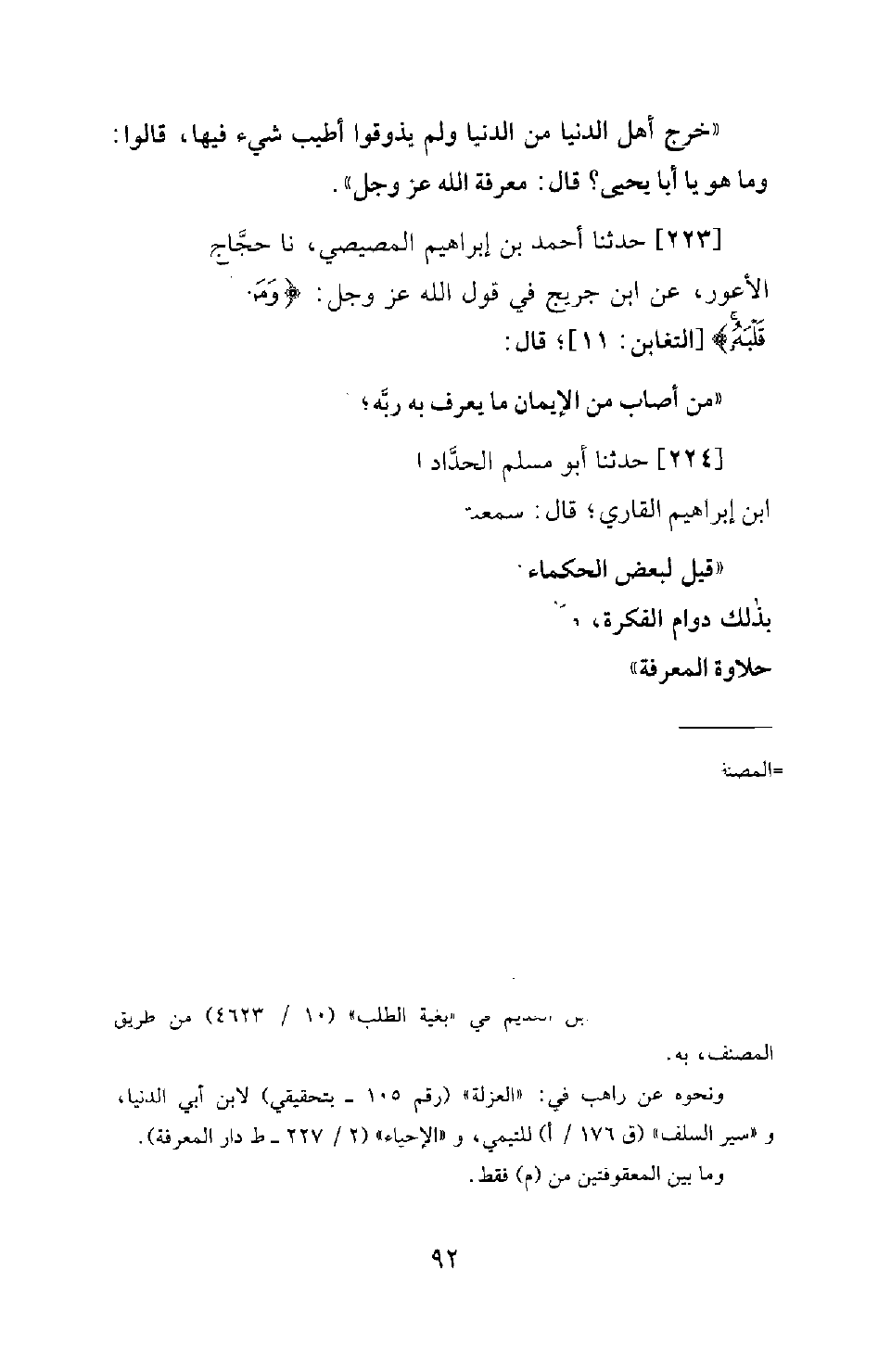 224 - حَدَّثَنَا أَبُو مُسْلِمٍ الْحَدَّادُ إِمَامُ مَسْجِدِ طَرَسُوسَ، نَا إِسْحَاقُ بن إبراهيم القاري؛ قَالَ: سَمِعْتُ أَبِي يَقُولُ: قِيلَ لِبَعْضِ الْحُكَمَاءِ: مَا أَرَادُوا بِالْخَلْوَةِ وَالْعُزْلَةِ؟ قَالَ: لِيَسْتَدْعُوا بِذَلِكَ دَوَامَ الْفِكْرَةِ، وَتَثْبُتُ فِي قُلُوبِهِمْ لِيَحْيَوْا حَيَاةً طَيِّبَةً، وَيَذُوقُوا لَذَاذَةَ حلاوة الْمَعْرِفَةِ.