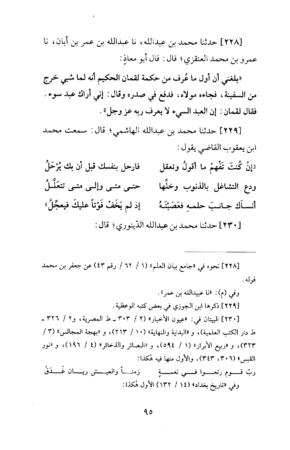 228 - حَدَّثَنَا مُحَمَّدُ بْنُ عبد الله، نا عَبْدِ اللهِ بْنِ عُمَرَ بْنِ أَبَانَ، نَا عَمْرُو بْنُ مُحَمَّدٍ الْعَنْقَزِيُّ؛ قَالَ: قَالَ أَبُو مُعَاذٍ: بَلَغَنِي أَنَّ أَوَّلَ مَا عُرِفَ مِنْ حِكْمَةِ لُقْمَانَ الْحَكِيمِ أَنَّهُ لَمَّا سُبِيَ خَرَجَ مِنَ السَّفِينَةِ، فَجَاءَهُ مَوْلَاهُ، فَدَفَعَ فِي صَدْرِهِ وَقَالَ: إِنِّي أَرَاكَ عَبْدَ سُوءٍ. فَقَالَ لُقْمَانُ: إِنَّ الْعَبْدَ السيء لَا يَعْرِفُ رَبَّهُ عَزَّ وَجَلَّ.