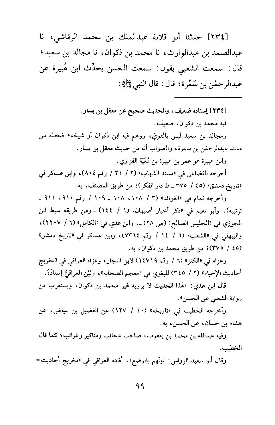 234 - حَدَّثَنَا أَبُو قِلَابَةَ عَبْدُ الْمَلِكِ بْنُ مُحَمَّدٍ الرَّقَاشِيُّ، نَا عَبْدُ الصَّمَدِ بْنُ عَبْدِ الْوَارِثِ، نَا مُحَمَّدُ بْنُ ذَكْوَانَ، نَا مُجَالِدُ بْنُ سَعِيدٍ؛ قَالَ: سَمِعْتُ الشَّعْبِيَّ يَقُولُ: سَمِعْتُ الْحَسَنَ يُحَدِّثُ ابن هُبيرة عَنْ عَبْدِ الرَّحْمَنِ بْنِ سَمُرَةَ؛ قَالَ: قَالَ النَّبِيُّ -[101]- صَلَّى اللَّهُ عَلَيْهِ وَسَلَّمَ: «مَا اسْتَرْعَى الله عَبْدًا رَعِيَّةً فَلَمْ يُحِطْهَا بِنَصِيحَةٍ؛ إِلَّا حَرَّمَ اللهُ عَلَيْهِ الْجَنَّةَ»