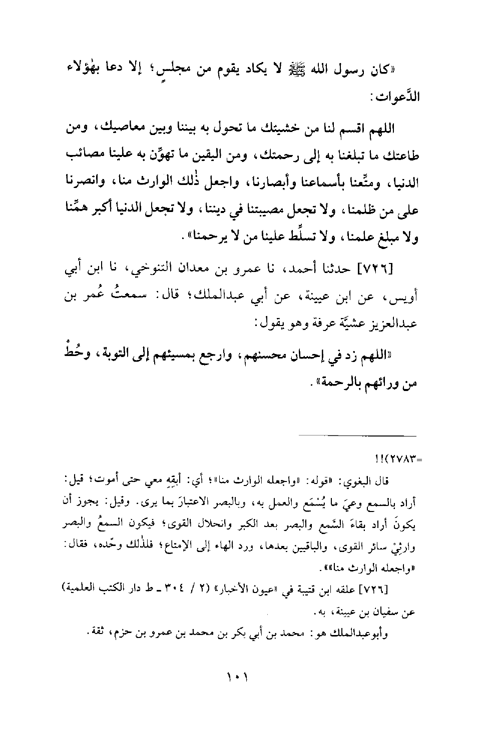 726 - حَدَّثَنَا أَحْمَدُ، نَا عَمْرُو بْنُ مَعْدَانَ التَّنُّوخِيُّ، نَا ابْنُ أَبِي أُوَيْسٍ، عَنِ ابْنِ عُيَيْنَةَ، عَنْ أَبِي عَبْدِ الْمَلِكِ؛ قَالَ: سَمِعْتُ عُمَرَ بْنَ عَبْدِ الْعَزِيزِ عَشِيَّةَ عَرَفَةَ وَهُوَ يَقُولُ: اللهُمَّ زِدْ فِي إِحْسَانِ مُحْسِنِهِمْ، وَارْجِعْ بِمُسِيئِهِمْ إِلَى التَّوْبَةِ، وَحُطْ مِنْ وَرَائِهِمْ بِالرَّحْمَةِ.