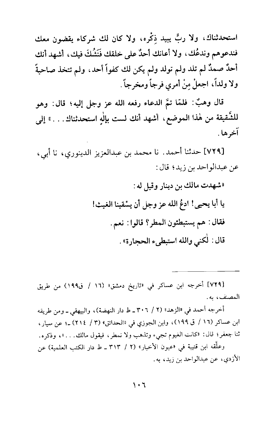 729 - حَدَّثَنَا أَحْمَدُ، نَا مُحَمَّدُ بْنُ عَبْدِ الْعَزِيزِ الدينوري، نَا أَبِي، عَنْ عَبْدِ الْوَاحِدِ بْنِ زَيْدٍ؛ قَالَ: شَهِدْتُ مَالِكَ بْنَ دِينَارٍ وَقِيلَ لَهُ: يَا أَبَا يَحْيَى! ادعُ اللهَ عَزَّ وَجَلَّ أَنْ يَسْقِيَنَا الْغَيْثَ! فَقَالَ: هُمْ يَسْتَبْطِئُونَ الْمَطَرَ؟ قَالُوا: نَعَمْ. قَالَ: لَكِنِّي وَاللهِ أَسْتَبْطِئُ الْحِجَارَةَ.