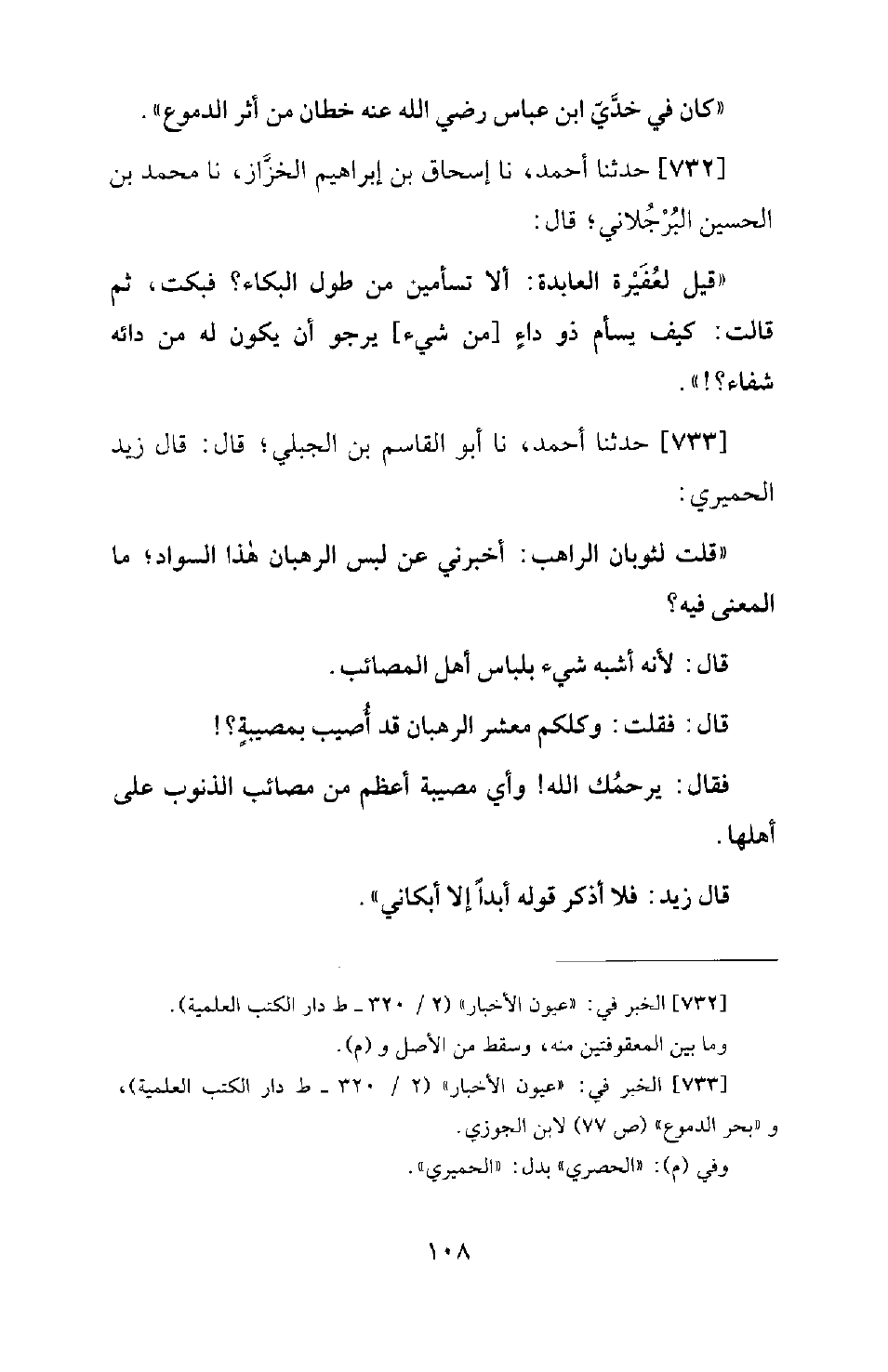 733 - حَدَّثَنَا أَحْمَدُ، نَا أَبُو الْقَاسِمِ بْنُ الْجَبَلِيِّ؛ قَالَ: قَالَ زَيْدٌ الْحِمْيَرِيُّ: قُلْتُ لِثَوْبَانَ الرَّاهِبِ: أَخْبَرْنِي عَنْ لِبْسِ الرُّهْبَانِ هَذَا السَّوَادِ؛ مَا الْمَعْنَى فِيهِ؟ قَالَ: لِأَنَّهُ أَشْبَهُ شَيْءٍ بِلِبَاسِ أَهْلِ الْمَصَائِبِ قَالَ: فَقُلْتُ: وَكُلُّكُمْ مَعْشَرَ الرُّهْبَانِ قَدْ أُصِيبَ بِمُصِيبَةٍ؟ ! فَقَالَ: يَرْحَمُكَ اللهُ! وَأَيُّ مُصِيبَةٍ أَعْظَمُ مِنْ مَصَائِبِ الذُّنُوبِ عَلَى أَهْلِهَا؟ ! قَالَ زَيْدٌ: فَلَا أَذْكَرُ قَوْلَهُ أَبَدًا إِلَّا أَبْكَانِي.