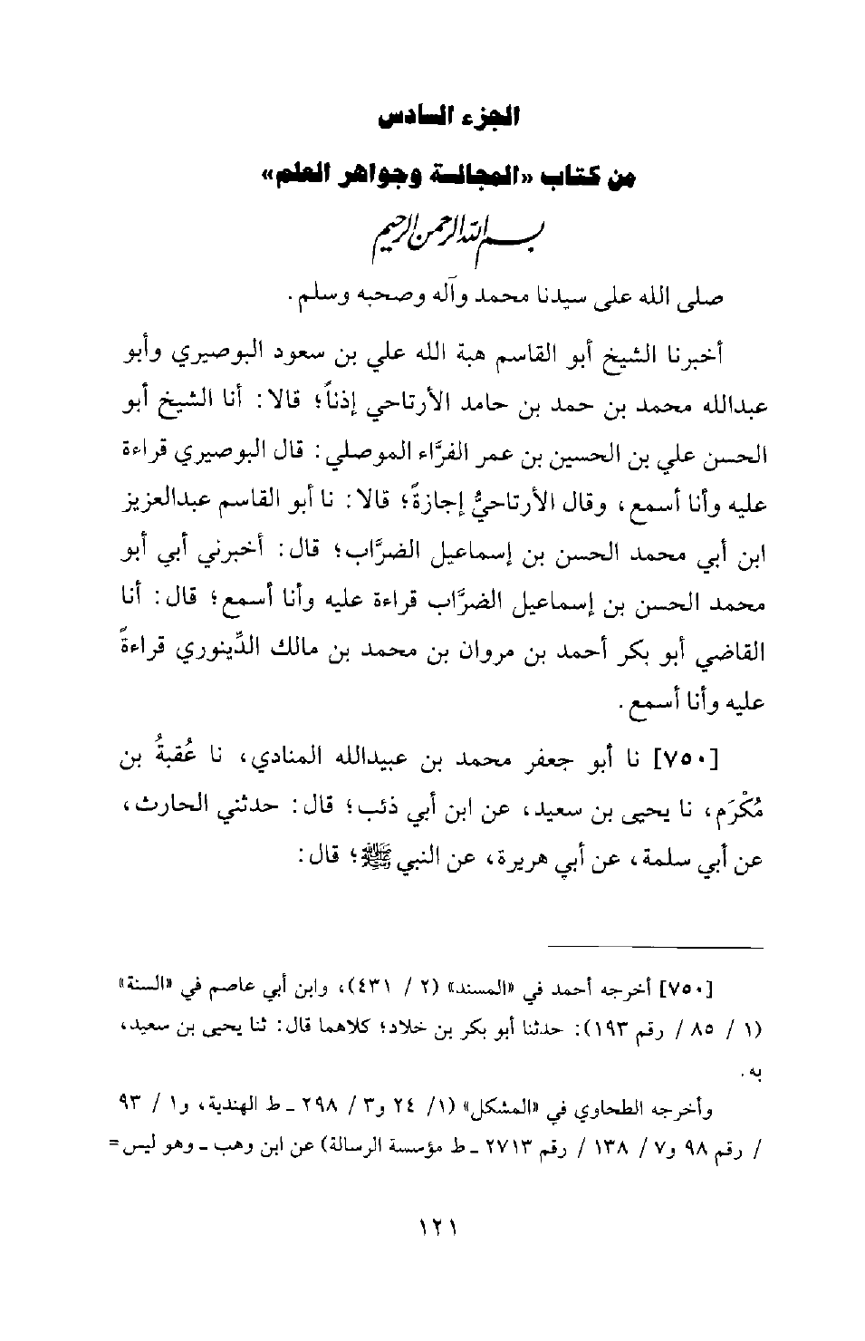 أخبرنا الشيخ أبو القاسم هبة الله بن علي بن سعود البوصيري وأبو عبد الله محمد بن حمد بن حامد الأرتاحي إذنا؛ قالا: أنا الشيخ أبو الحسن علي بن الحسين بن عمر الفراء الموصلي؛ قال البوصيري: قراءة عليه وأنا أسمع، وقال الأرتاحي: إجازة؛ قال: نا أبو القاسم عبد العزيز بن أبي محمد الحسن بن إسماعيل الضراب؛ قال: أخبرني أبي أبو محمد الحسن بن إسماعيل الضراب قراءة عليه وأنا أسمع؛ قال: أنا القاضي أبو بكر أحمد بن مروان بن محمد بن مالك الدينوري قراءة عليه وأنا أسمع: