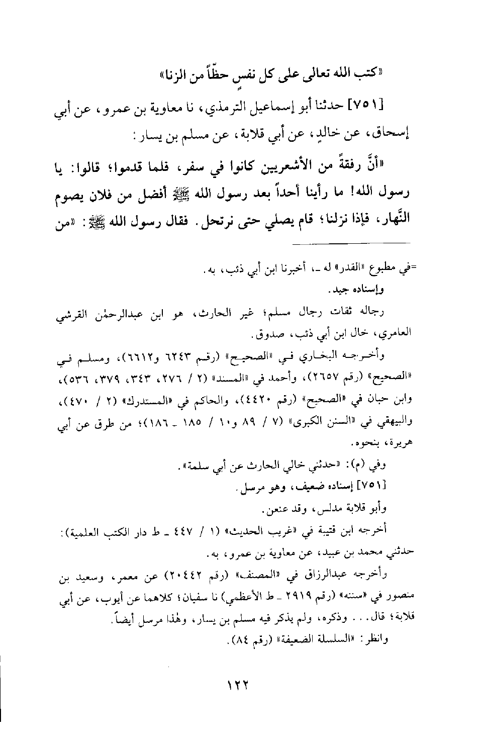 751 - حَدَّثَنَا أَبُو إِسْمَاعِيلَ التِّرْمِذِيُّ، نَا مُعَاوِيَةُ بْنُ عَمْرٍو، عَنْ أَبِي إِسْحَاقَ، عَنْ خَالِدٍ، عَنْ أَبِي قِلَابَةَ، عَنْ مُسْلِمِ بْنِ يَسَارٍ: أَنَّ رِفْقَةً مِنَ الْأَشْعَرِيِّينَ كَانُوا فِي سَفَرٍ، فَلَمَّا قَدِمُوا؛ قالوا: يارسول اللهِ! مَا رَأَيْنَا أَحَدًا بَعْدَ رَسُولِ اللهِ صَلَّى اللَّهُ عَلَيْهِ وَسَلَّمَ أَفْضَلَ مِنْ فُلَانٍ، يَصُومُ النَّهَارَ، فَإِذَا نَزَلْنَا؛ قَامَ يُصَلِّي حَتَّى نَرْتَحِلَ. فَقَالَ رَسُولُ اللهِ صَلَّى اللَّهُ عَلَيْهِ وَسَلَّمَ: «مَنْ -[123]- كَانَ يَمْهَنُ لَهُ أَوْ يَكْفِيهِ أَوْ يَسْعَى لَهُ؟» . قَالُوا: نَحْنُ. فَقَالَ رَسُولُ اللهِ صَلَّى اللَّهُ عَلَيْهِ وَسَلَّمَ: «كُلُّكُمْ أَفْضَلُ مِنْهُ»