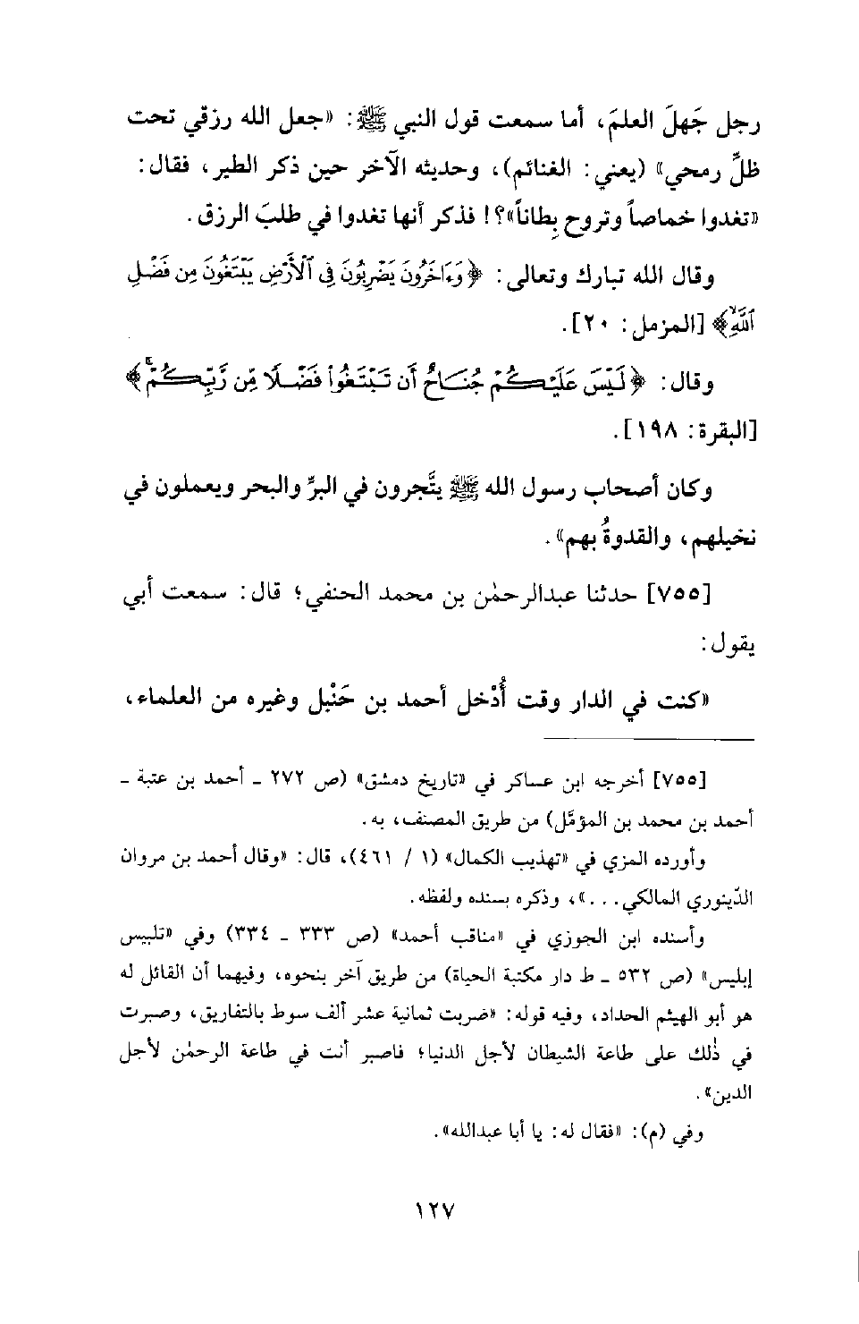 755 - حَدَّثَنَا عَبْدُ الرَّحْمَنِ بْنُ مُحَمَّدٍ الْحَنَفِيُّ؛ قَالَ: سَمِعْتُ أَبِي يَقُولُ: كُنْتُ فِي الدَّارِ وَقْتَ أُدْخِلَ أَحْمَدُ بْنُ حَنْبَلٍ وَغَيْرُهُ مِنَ الْعُلَمَاءِ، -[128]- فَلَمَّا مُدَّ أَحْمَدُ لِيُضْرَبَ بِالسَّوْطِ، دَنَا مِنْهُ رَجُلٌ، فَقَالَ: يَا أَبَا عَبْدِ اللهِ! أَنَا رَسُولُ خَالِدٍ الْحَدَّادِ مِنَ الْحَبْسِ، وَيَقُولُ لَكَ: اثْبُتْ عَلَى مَا أَنْتَ عَلَيْهِ، وَإِيَّاكَ أَنْ تَجْزَعَ مِنَ الضَّرْبِ؛ فَإِنِّي قَدْ ضُرِبْتُ أَلْفَ حَدٍّ فِي الشَّيْطَانِ، وَأَنْتَ تُضْرَبُ فِي اللهِ تَبَارَكَ وَتَعَالَى.