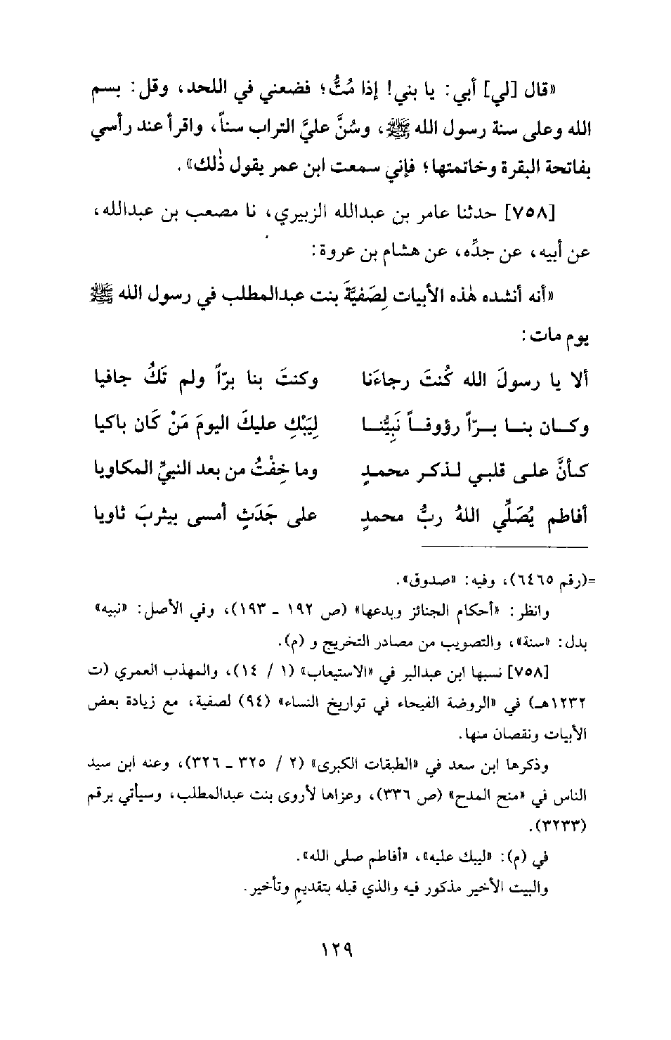 758 - حَدَّثَنَا عَامِرُ بْنُ عَبْدِ اللهِ الزُّبَيْرِيُّ، نَا مُصْعَبُ بْنُ عَبْدِ اللهِ، عَنْ أَبِيهِ، عَنْ جَدِّهِ، عَنْ هِشَامِ بْنِ عُرْوَةَ: أَنَّهُ أَنْشَدَهُ هَذِهِ الْأَبْيَاتِ لِصَفِيَّةَ بِنْتِ عَبْدِ الْمُطَّلِبِ فِي رَسُولِ اللهِ صَلَّى اللَّهُ عَلَيْهِ وَسَلَّمَ يَوْمَ مات: