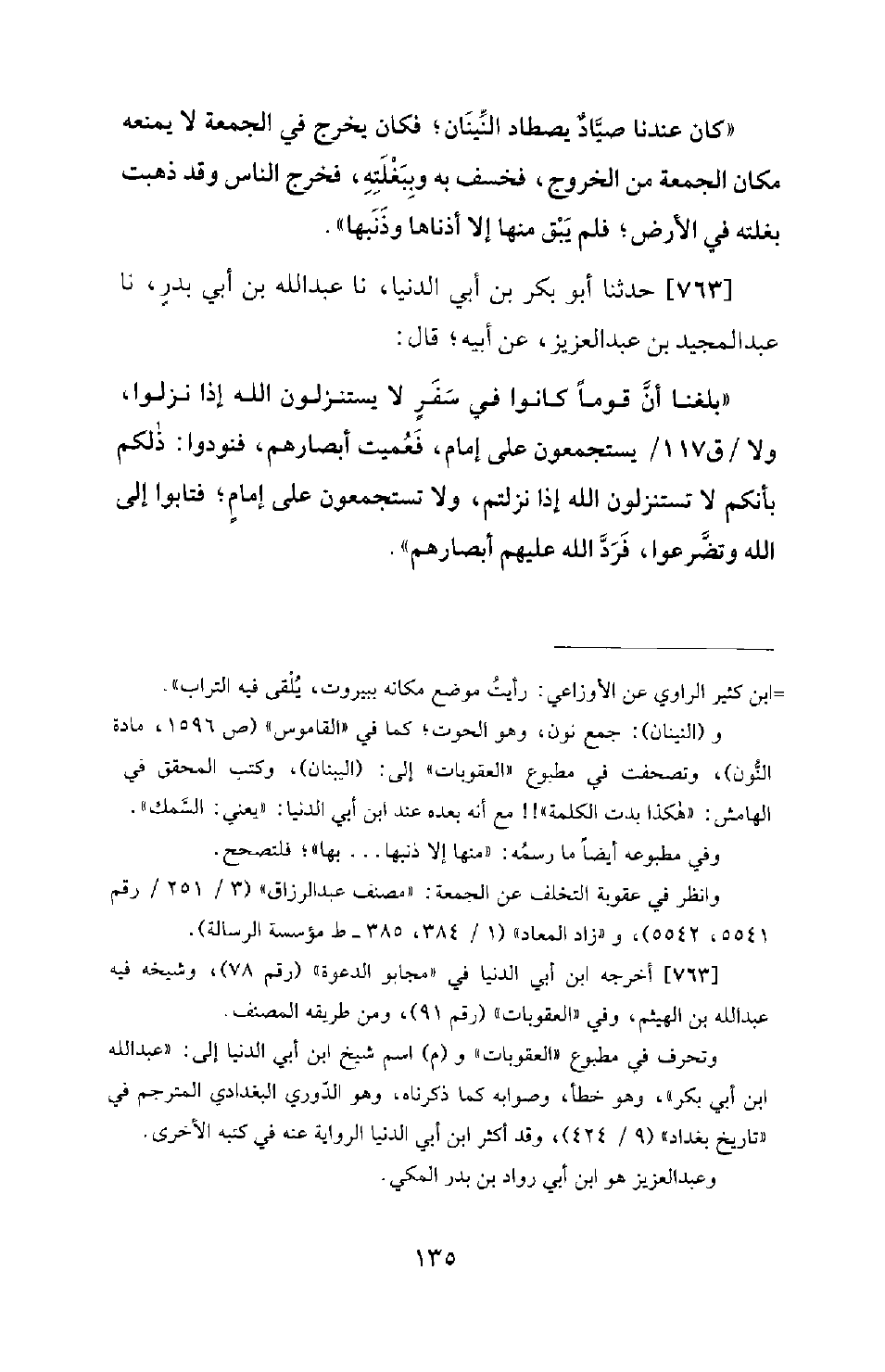 763 - حَدَّثَنَا أَبُو بَكْرِ بْنُ أَبِي الدُّنْيَا، نَا عَبْدُ اللهِ بْنُ أَبِي بَدْرٍ، نَا عَبْدُ الْمَجِيدِ بْنُ عَبْدِ الْعَزِيزِ، عَنْ أَبِيهِ، قَالَ: بَلَغَنَا أَنَّ قَوْمًا كَانُوا فِي سَفَرٍ لَا يَسْتَنْزِلُونَ اللهَ إِذَا نَزَلُوا، وَلَا يَسْتَجْمِعُونَ عَلَى إِمَامٍ، فَعُمِيَتْ أَبْصَارُهُمْ، فَنُودُوا: ذَلِكُمْ بِأَنَّكُمْ لَا تَسْتَنْزِلُونَ اللهَ إِذَا نَزَلْتُمْ، وَلَا تَسْتَجْمِعُونَ عَلَى إِمَامٍ؛ فَتَابُوا إِلَى اللهِ وَتَضَرَّعُوا، فَرَدَّ اللهُ عَلَيْهِمْ أَبْصَارَهُمْ.