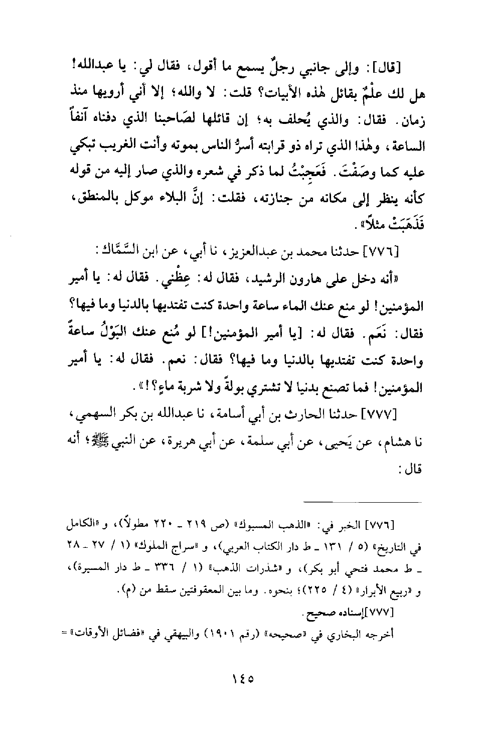 776 - حَدَّثَنَا مُحَمَّدُ بْنُ عَبْدِ الْعَزِيزِ، نَا أَبِي، عَنِ ابْنِ السَّمَّاكِ: أَنَّهُ دَخَلَ عَلَى هَارُونَ الرَّشِيدِ، فَقَالَ لَهُ: عِظْنِي. فَقَالَ لَهُ: يَا أَمِيرَ الْمُؤْمِنِينَ! لَوْ مُنِعَ عَنْكَ الْمَاءُ سَاعَةً وَاحِدَةً كُنْتَ تفتيدها بِالدُّنْيَا وَمَا فِيهَا؟ فَقَالَ: نَعَمْ. فَقَالَ لَهُ: يَا أَمِيرَ الْمُؤْمِنِينَ! لَوْ مُنِعَ عَنْكَ الْبَوْلُ سَاعَةً وَاحِدَةً كنت تفتيدها بِالدُّنْيَا وَمَا فِيهَا؟ فَقَالَ: نَعَمْ. فَقَالَ لَهُ: يَا أَمِيرَ الْمُؤْمِنِينَ! فَمَا تَصْنَعُ بِدُنْيَا لَا تَشْتَرِي بَوْلةً وَلَا شَرْبَةَ مَاءٍ؟ !