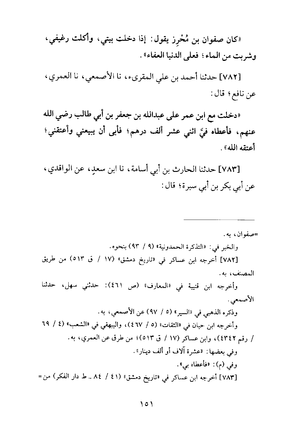 782 - حَدَّثَنَا أَحْمَدُ بْنُ عَلِيٍّ الْمُقْرِئُ، نَا الْأَصْمَعِيُّ، نَا الْعُمَرِيُّ، عَنْ نَافِعٍ؛ قَالَ: دَخَلْتُ مَعَ ابْنِ عُمَرَ عَلَى عَبْدِ اللهِ بْنِ جَعْفَرِ بْنِ أَبِي طَالِبٍ رَضِيَ اللهُ عَنْهُمْ، فَأَعْطَاهُ فِيَّ اثنى عَشَرَ أَلْفَ دِرْهَمٍ؛ فَأَبَى أَنْ يَبِيعَنِي وَأَعْتَقَنِي؛ أَعْتَقَهُ اللهُ.